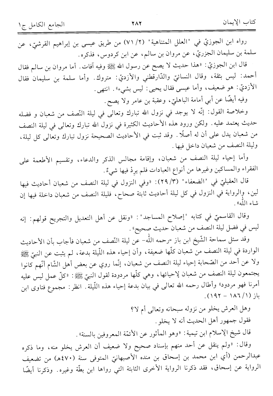 قال العقيليّ في "الضعفاء" (٣/ ٢٩): "وفي النزول في ليلة النصف من شعبان أحاديث فيها لين، والرواية في النزول في كل ليلة أحاديث ثابتة صحاح، فليلة النصف من شعبان داخلة فيها إن شاء اللَّه".