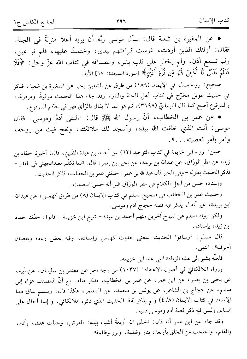 وحديث عمر بن الخطاب في صحيح مسلم في كتاب الإيمان (٨) من طريق كهمس، عن عبد اللَّه ابن بريدة، غير أنه لم يذكر فيه قصة حجاج آدم وموسى.