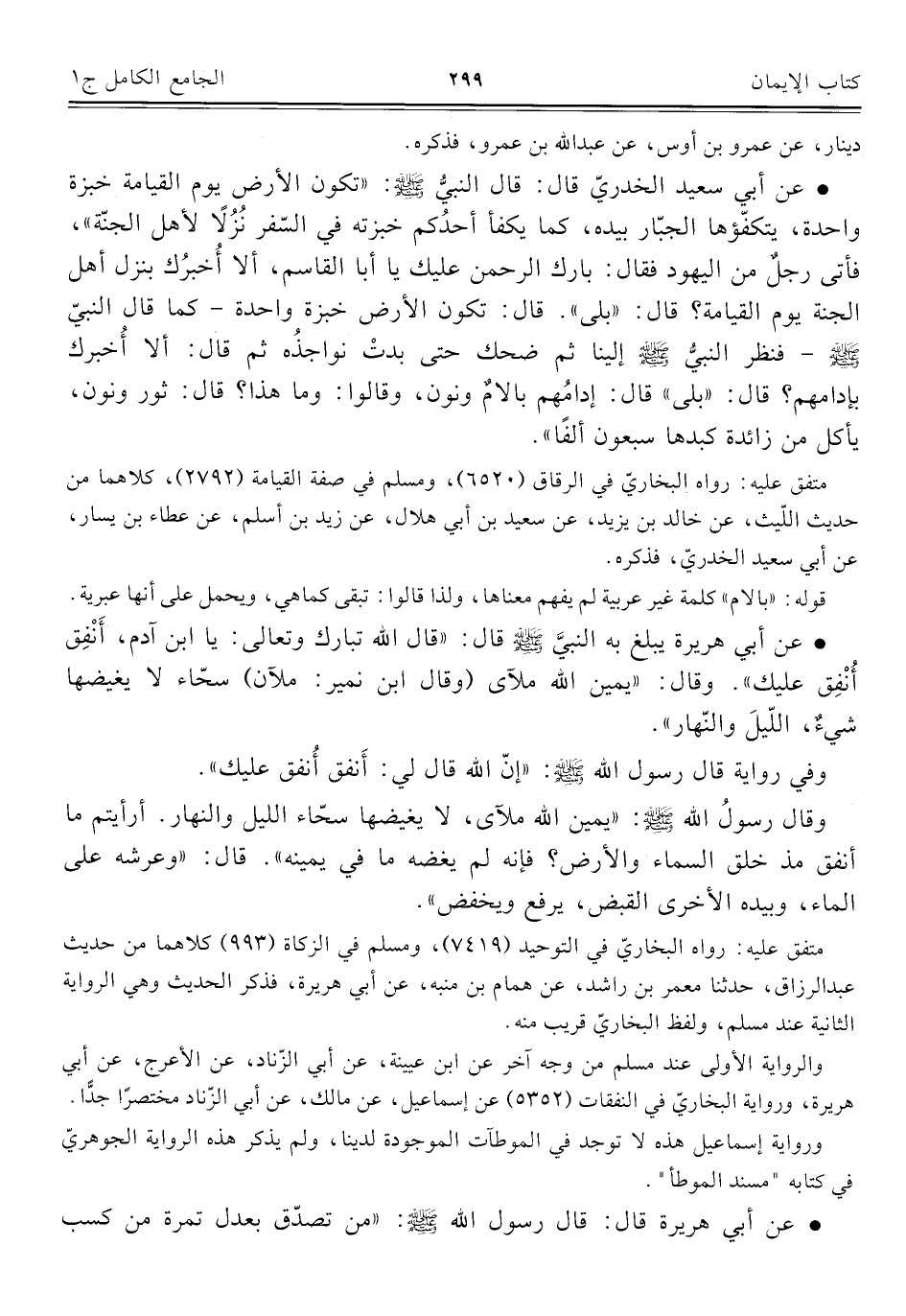 والرواية الأولى عند مسلم من وجه آخر عن ابن عيينة، عن أبي الزّناد، عن الأعرج، عن أبي هريرة، ورواية البخاريّ في النفقات (٥٣٥٢) عن إسماعيل، عن مالك، عن أبي الزّناد مختصرًا جدًا.