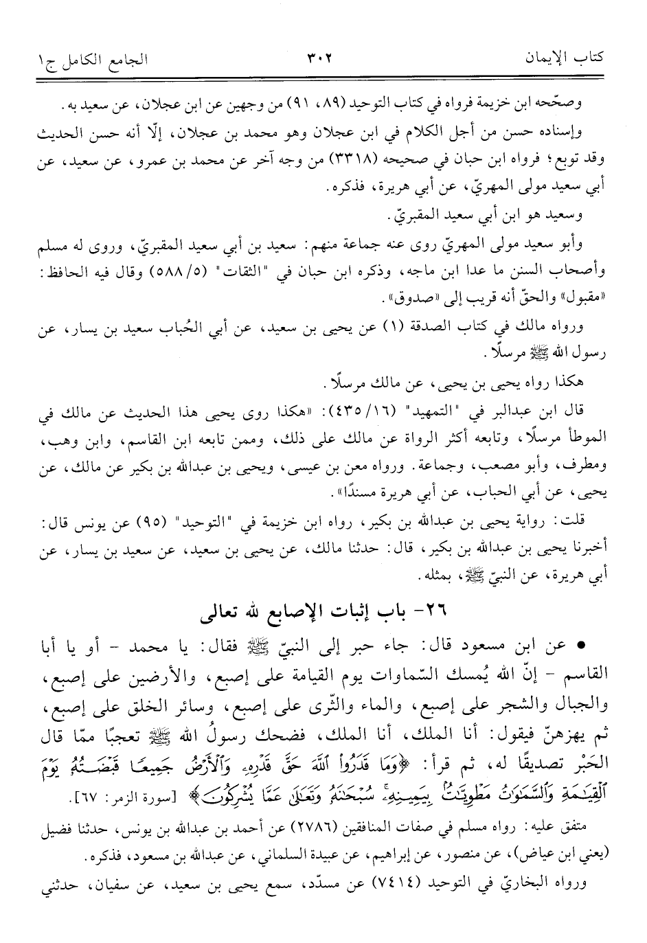 • عن ابن مسعود قال: جاء حبر إلى النبيّ -صلى اللَّه عليه وسلم- فقال: يا محمد -أو يا أبا القاسم- إنّ اللَّه يُمسك السّماوات يوم القيامة على إصبع، والأرضين على إصبع، والجبال والشجر على إصبع، والماء والثّرى على إصبع، وسائر الخلق على إصبع، ثم يهزهنّ فيقول: أنا الملك، أنا الملك، فضحك رسولُ اللَّه -صلى اللَّه عليه وسلم- تعجبًا ممّا قال الحَبْر تصديقًا له، ثم قرأ: {وَمَا قَدَرُوا اللَّهَ حَقَّ قَدْرِهِ وَالْأَرْضُ جَمِيعًا قَبْضَتُهُ يَوْمَ الْقِيَامَةِ وَالسَّمَاوَاتُ مَطْوِيَّاتٌ بِيَمِينِهِ سُبْحَانَهُ وَتَعَالَى عَمَّا يُشْرِكُونَ} [سورة الزمر: ٦٧].