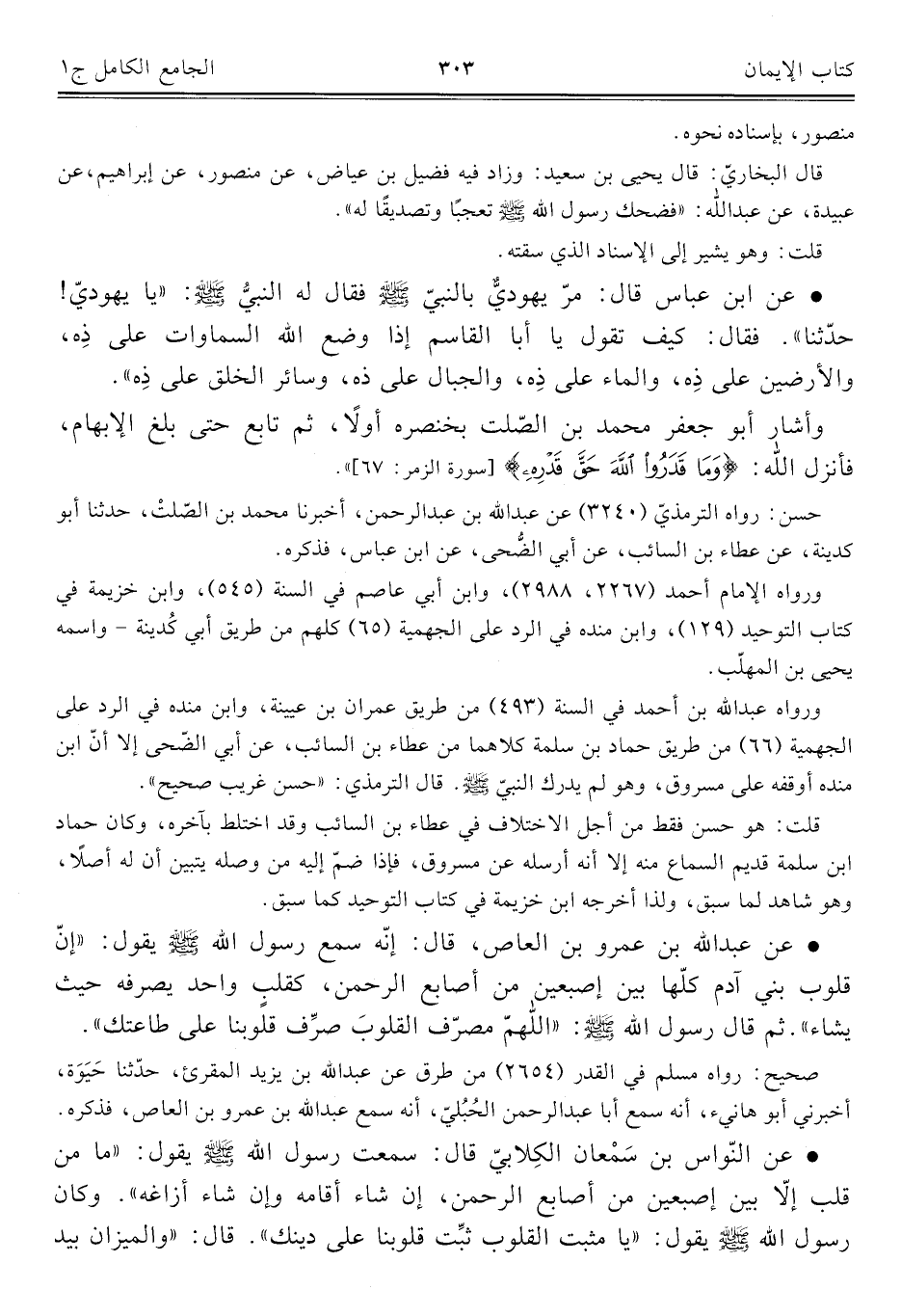 • عن النّواس بن سَمْعان الكِلابيّ قال: سمعت رسول اللَّه -صلى اللَّه عليه وسلم- يقول: "ما من قلب إِلَّا بين إصبعين من أصابع الرحمن، إن شاء أقامه وإن شاء أزاغه". وكان رسول اللَّه -صلى اللَّه عليه وسلم- يقول: "يا مثبت القلوب ثبِّت قلوبنا على دينك". قال: "والميزان بيد
