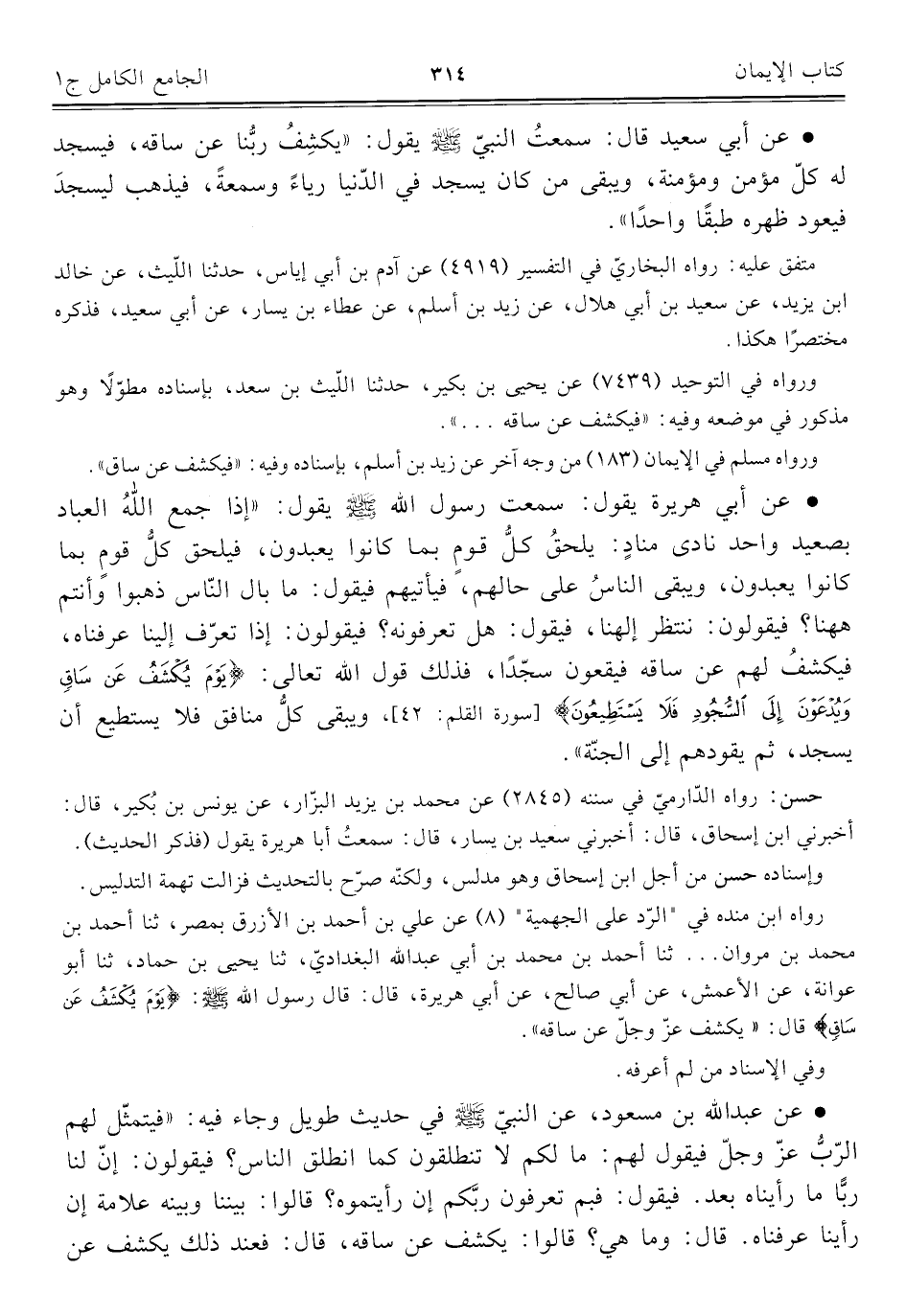 • عن أبي هريرة يقول: سمعت رسول اللَّه -صلى اللَّه عليه وسلم- يقول: "إذا جمع اللَّهُ العباد بصعيد واحد نادى منادٍ: يلحقُ كلُّ قومٍ بما كانوا يعبدون، فيلحق كلُّ قومٍ بما كانوا يعبدون، ويبقى الناسُ على حالهم، فيأتيهم فيقول: ما بال النّاس ذهبوا وأنتم ههنا؟ فيقولون: ننتظر إلهنا، فيقول: هل تعرفونه؟ فيقولون: إذا تعرّف إلينا عرفناه، فيكشفُ لهم عن ساقه فيقعون سجّدًا، فذلك قول اللَّه تعالى: {يَوْمَ يُكْشَفُ عَنْ سَاقٍ وَيُدْعَوْنَ إِلَى السُّجُودِ فَلَا يَسْتَطِيعُونَ} [سورة القلم: ٤٢]، ويبقى كلُّ منافق فلا يستطيع أن يسجد، ثم يقودهم إلى الجنّة".