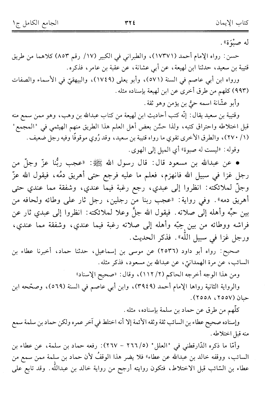وقتيبة بن سعيد يقال: إنّه كتب أحاديث ابن لهيعة من كتاب عبد اللَّه بن وهب، وهو ممن سمع منه قبل اختلاطه واحتراق كتبه، ولذا حسَّن بعض أهل العلم هذا الطريق منهم الهيثمي في "المجمع" (١/ ٢٧٠)، والطرق الأخرى تقوي ما رواه قتيبة بن سعيد، وقد رُوي موقوفًا وفيه رجل ضعيف.