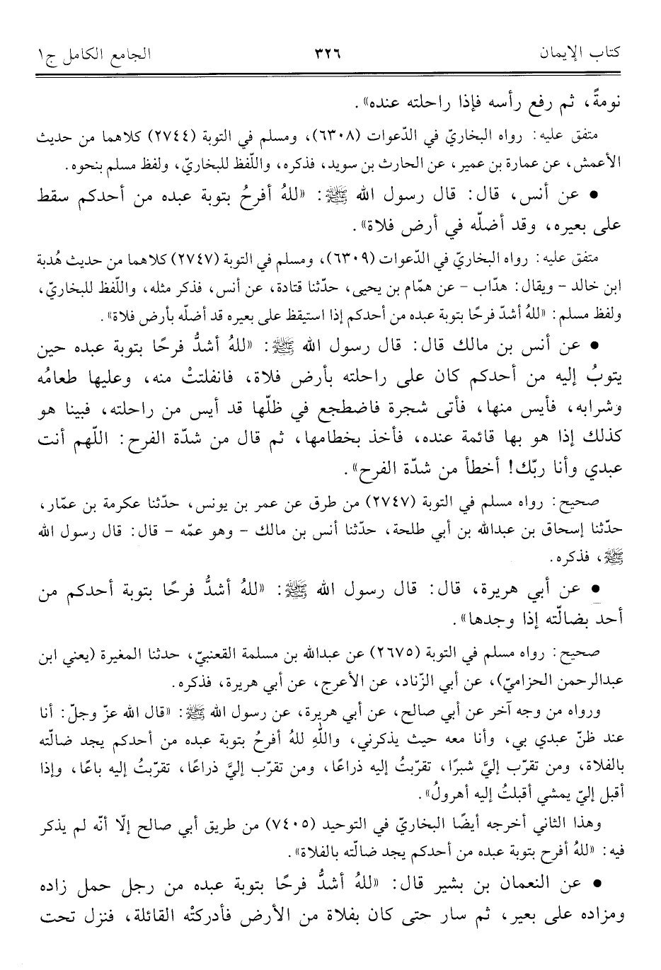 • عن أنس بن مالك قال: قال رسول اللَّه -صلى اللَّه عليه وسلم-: "للَّهُ أشدُّ فرحًا بتوبة عبده حين يتوبُ إليه من أحدكم كان على راحلته بأرض فلاة، فانفلتتْ منه، وعليها طعامُه وشرابه، فأيس منها، فأتى شجرة فاضطجع في ظلّها قد أيس من راحلته، فبينا هو كذلك إذا هو بها قائمة عنده، فأخذ بخطامها، ثم قال من شدّة الفرح: اللهم أنت عبدي وأنا ربّك! أخطأ من شدّة الفرح".