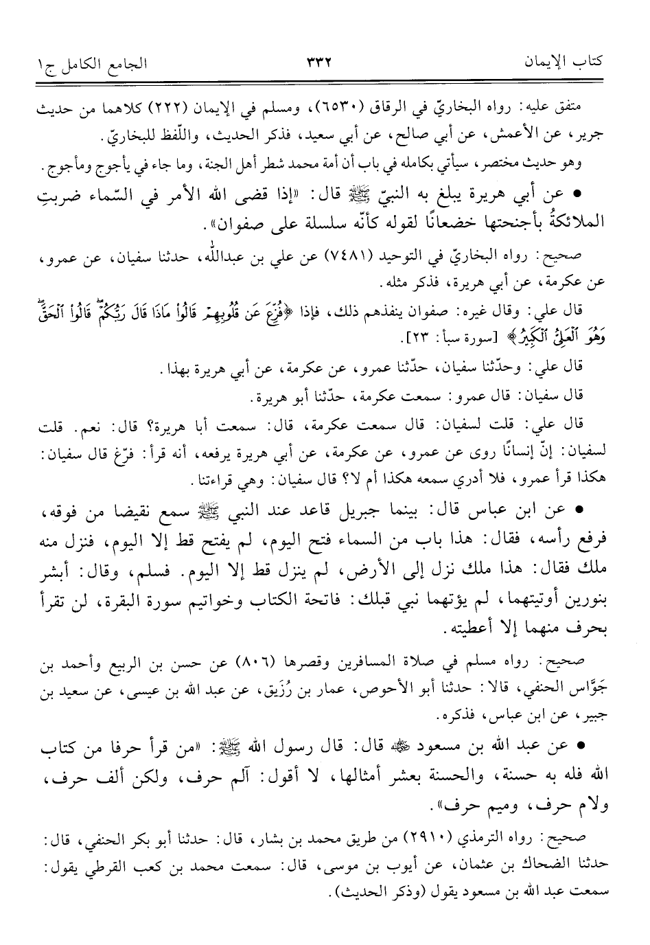 • عن أبي هريرة يبلغ به النبيّ -صلى اللَّه عليه وسلم- قال: "إذا قضى اللَّه الأمر في السّماء ضربتِ الملائكةُ بأجنحتها خضعانًا لقوله كأنّه سلسلة على صفوان".