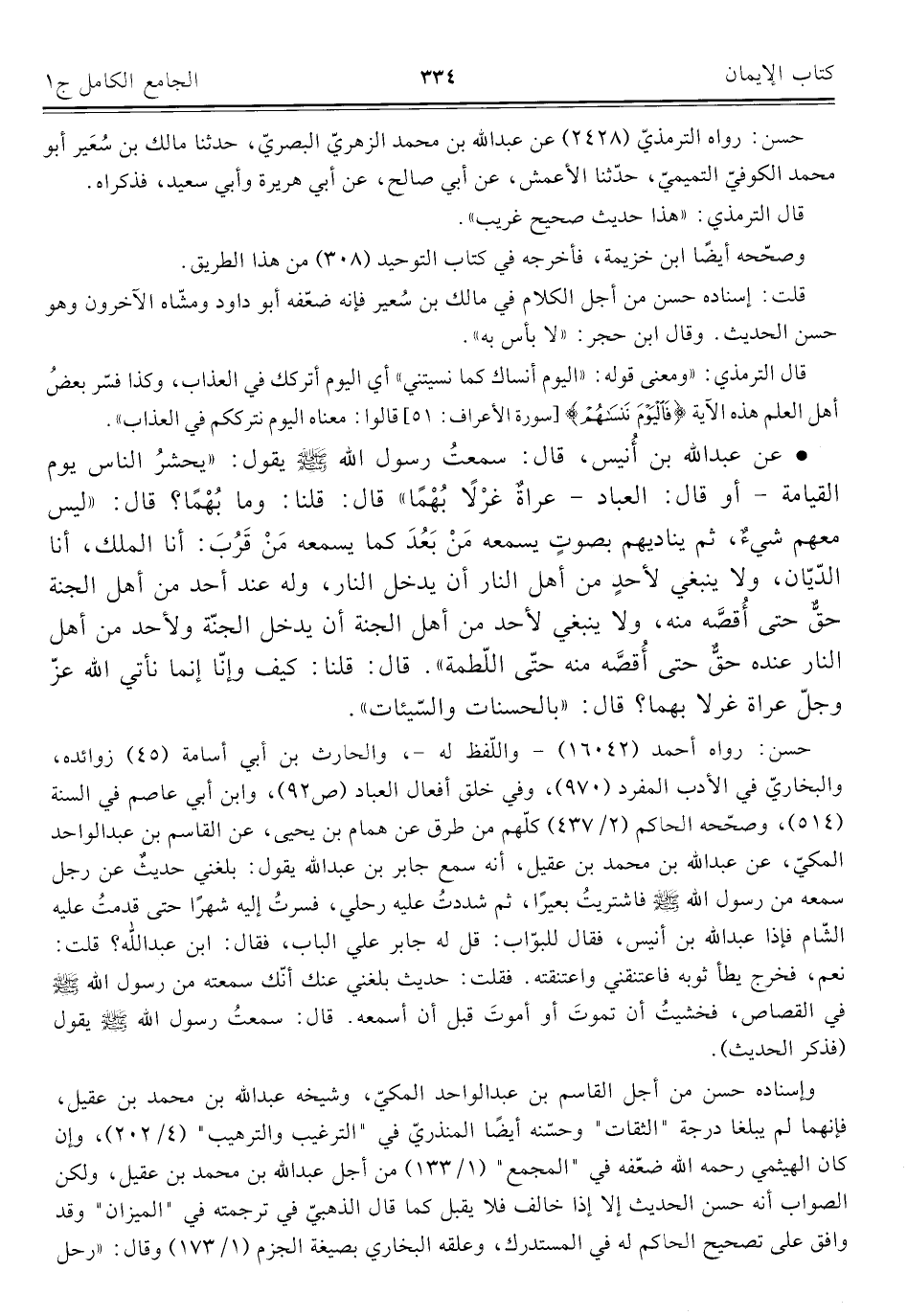 حسن: رواه أحمد (١٦٠٤٢) -واللّفظ له-، والحارث بن أبي أسامة (٤٥) زوائده، والبخاريّ في الأدب المفرد (٩٧٠)، وفي خلق أفعال العباد (ص ٩٢)، وابن أبي عاصم في السنة (٥١٤)، وصحّحه الحاكم (٢/ ٤٣٧) كلهم من طرق عن همام بن يحيى، عن القاسم بن عبد الواحد المكيّ، عن عبد اللَّه بن محمد بن عقيل، أنه سمع جابر بن عبد اللَّه يقول: بلغني حديثٌ عن رجل سمعه من رسول اللَّه -صلى اللَّه عليه وسلم- فاشتريتُ بعيرًا، ثم شددتُ عليه رحلي، فسرتُ إليه شهرًا حتى قدمتُ عليه الشّام فإذا عبد اللَّه بن أنيس، فقال للبوّاب: قل له جابر علي الباب، فقال: ابن عبد اللَّه؟ قلت: نعم، فخرج يطأ ثوبه فاعتنقني واعتنقته، فقلت: حديث بلغني عنك أنّك سمعته من رسول اللَّه -صلى اللَّه عليه وسلم- في القصاص، فخشيتُ أن تموتَ أو أموتَ قبل أن أسمعه. قال: سمعتُ رسول اللَّه -صلى اللَّه عليه وسلم- يقول (فذكر الحديث).