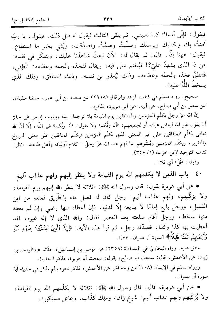 ٤٠ - باب الذين لا يكلمهم اللَّه يوم القيامة ولا ينظر إليهم ولهم عذاب أليم