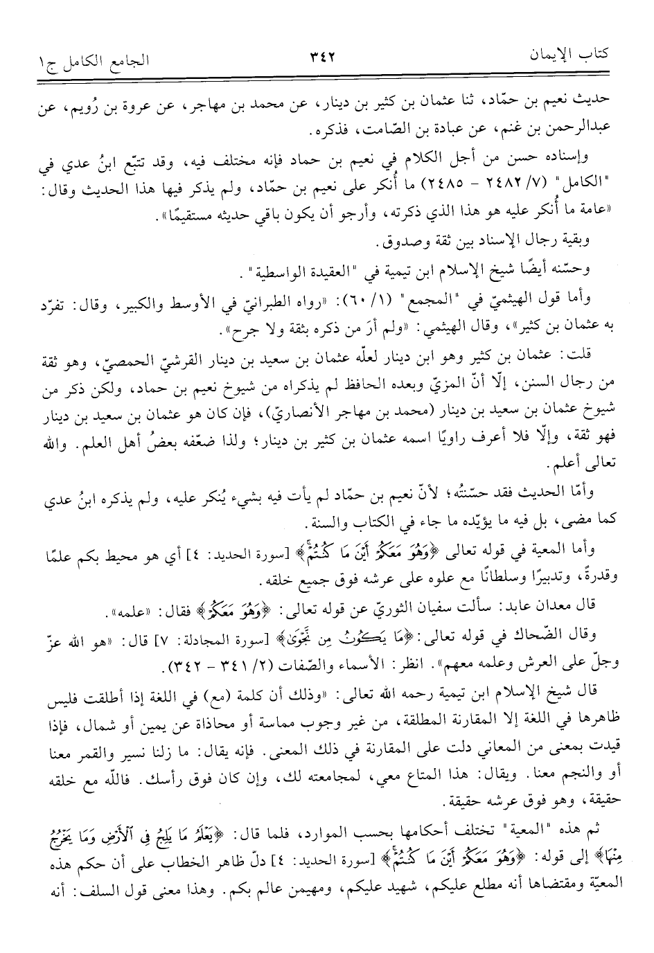وأما المعية في قوله تعالى {وَهُوَ مَعَكُمْ أَيْنَ مَا كُنْتُمْ} [سورة الحديد: ٤] أي هو محيط بكم علمًا وقدرةً، وتدبيرًا وسلطانًا مع علوه على عرشه فوق جميع خلقه.