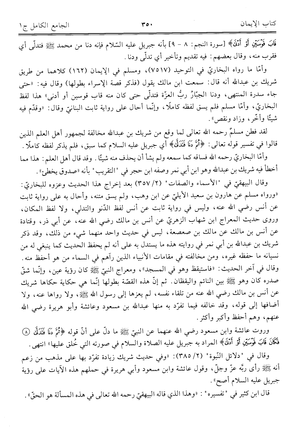 وأمّا ما رواه البخاريّ في التوحيد (٧٥١٧)، ومسلم في الإيمان (١٦٢) كلاهما من طريق شريك بن عبد اللَّه أنه قال: سمعت ابن مالك يقول (فذكر قصة الإسراء بطولها) وقال فيه: "حتى جاء سدرة المنتهى، ودنا الجبّارُ ربُّ العزّة فتدلّى حتى كان منه قاب قوسين أو أدنى" هذا لفظ البخاريّ، وأمّا مسلم فلم يسق لفظه كاملًا، وإنّما أحال على رواية ثابت البنانيّ وقال: "وقدَّم فيه شيئًا وأخّر، وزاد ونقص".