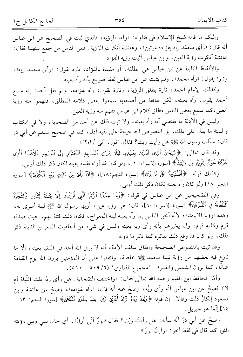 وإليكم ما قاله شيخ الإسلام في فتاواه: "وأمّا الرؤية، فالذي ثبت في الصحيح عن ابن عباس أنه قال: "رأى محمّد ربه بفؤاده مرتين" وعائشة أنكرت الرّؤية. فمن الناس من جمع بينهما فقال: عائشة أنكرت رؤية العين، وابن عباس أثبت رؤية الفؤاد.