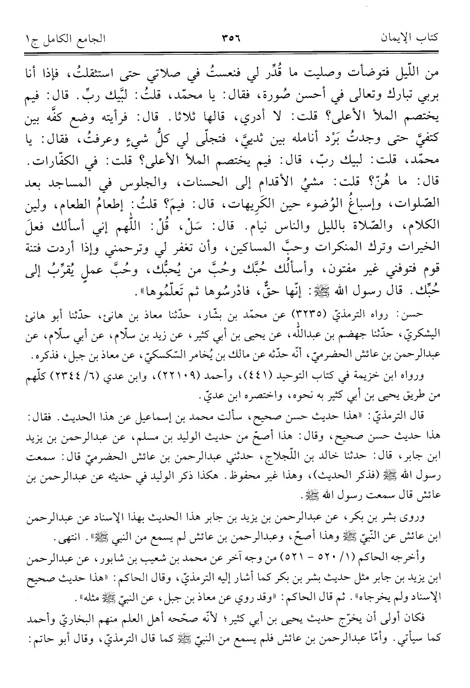 من اللّيل فتوضأت وصليت ما قُدِّر لي فنعستُ في صلاتي حتى استثقلتُ، فإذا أنا بربي تبارك وتعالى في أحسن صُورة، فقال: يا محمّد، قلتُ: لبَّيك ربِّ. قال: فيم يختص الملأ الأعلى؟ قلت: لا أدري، قالها ثلاثا. قال: فرأيته وضع كفَّه بين كتفيَّ حتى وجتُ بَرْد أنامله بين ثدييَّ، فتجلّى لي كلُّ شيءٍ وعرفتُ، فقال: يا محمّد، قلت: لبيك ربّ، قال: فيم يختصم الملأ الأعلى؟ قلت: في الكفّارات. قال: ما هُنَّ؟ قلت: مشيُ الأقدام إلى الحسنات، والجلوس في المساجد بعد الصّلوات، وإسباغُ الوضوء حين الكَرِيهات، قال: فيمَ؟ قلتُ: إطعامُ الطعام، ولين الكلام، والصّلاة بالليل والناس نيام. قال: سَلْ، قُلْ: اللَّهُمَّ إني أسألك فعلَ الخيرات وترك المنكرات وحبَّ المساكين، وأن تغفر لي وترحمني وإذا أردت فتنة قوم فتوفني غير مفتون، وأسألُك حُبَّك وحُبَّ من يُحبُّك، وحُبَّ عملٍ يُقرِّبُ إلى حُبِّك. قال رسول اللَّه -صلى اللَّه عليه وسلم-: إنَّها حقٌّ، فادْرسُوها ثم تَعلّمُوها".