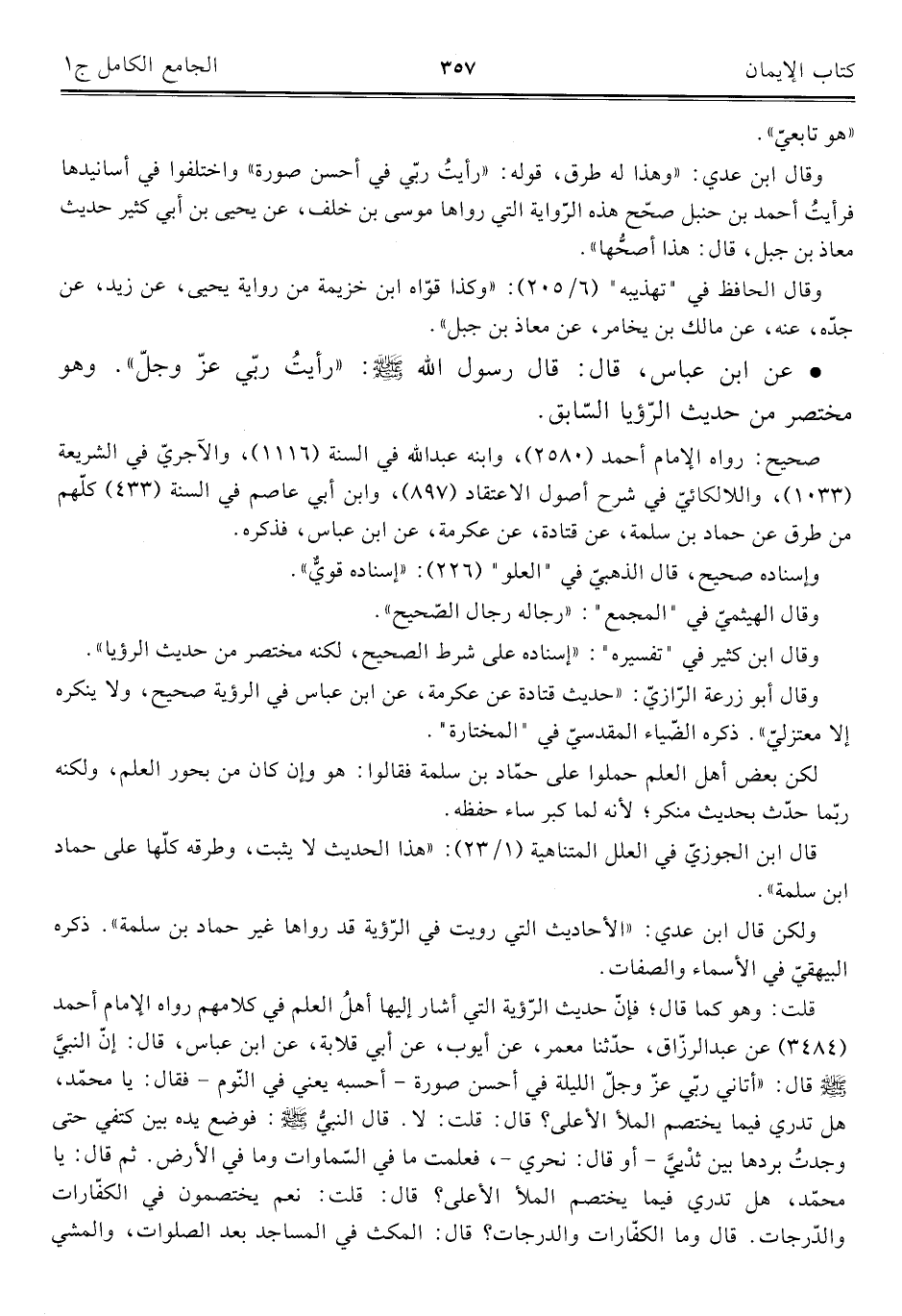 وقال ابن عدي: وهذا له طرق، قوله: "رأيتُ ربّي في أحسن صورة" واختلفوا في أسانيدها فرأيتُ أحمد بن حنبل صحّح هذه الرّواية التي رواها موسى بن خلف، عن يحيى بن أبي كثير حديث معاذ بن جبل، قال: هذا أصحُّها".