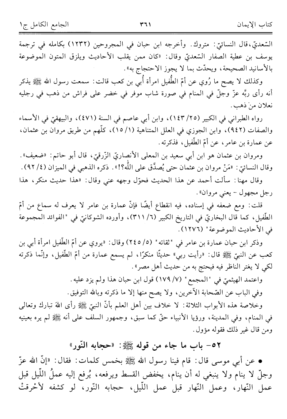 وكذلك لا يصح ما رُوي عن أمّ الطُّفيل امرأة أُبي بن كعب قالت: سمعت رسول اللَّه -صلى اللَّه عليه وسلم- يذكر أنه رأى ربَّه عزّ وجلّ في المنام في صورة شاب موفر في خضر على فراش من ذهب في رجليه نعلان من ذهب.