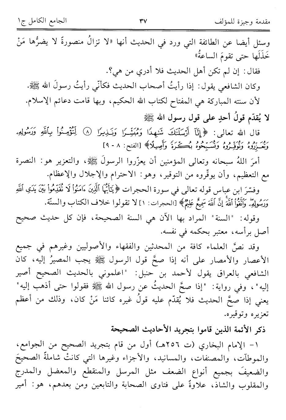 وقد نصَّ العلماء كافة من المحدثين والفقهاء والأصوليين وغيرهم في جميع الأعصار والأمصار على أنه إذا صحَّ قول الرسول -صلى اللَّه عليه وسلم- يجب المصيرُ إليه، كان الشافعي بالعراق يقول لأحمد بن حنبل: "اعلموني بالحديث الصحيح أصير إليه"، وفي رواية: "إذا صحَّ الحديثُ عن رسول اللَّه -صلى اللَّه عليه وسلم- فقولوا حتى أذهب إليه" يعني إذا صحَّ الحديث فلا يُقدّم عليه قولُ غيره كائنا مَنْ كان، وذلك من أعظم تعزيره وتوقيره.