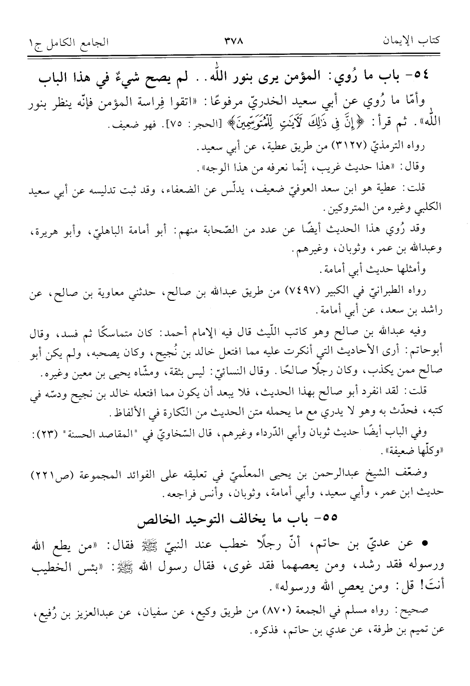 ٥٤ - باب ما رُوي: المؤمن يرى بنور اللَّه. . . لم يصح شيءٌ في هذا الباب
