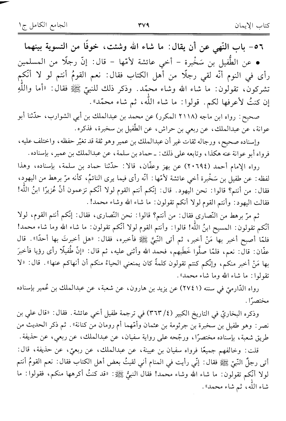 • عن الطُّفيل بن سَخْبرة -أخي عائشة لأمّها- قال: إنّ رجلًا من المسلمين رأى في النوم أنّه لقي رجلًا من أهل الكتاب فقال: نعم القومُ أنتم لولا أنّكم تشركون، تقولون: ما شاء اللَّه وشاء محمّد. وذكر ذلك للنبيّ -صلى اللَّه عليه وسلم- فقال: "أما واللَّه إن كنتُ لأعرفها لكم. قولوا: ما شاء اللَّه، ثم شاء محمّد".