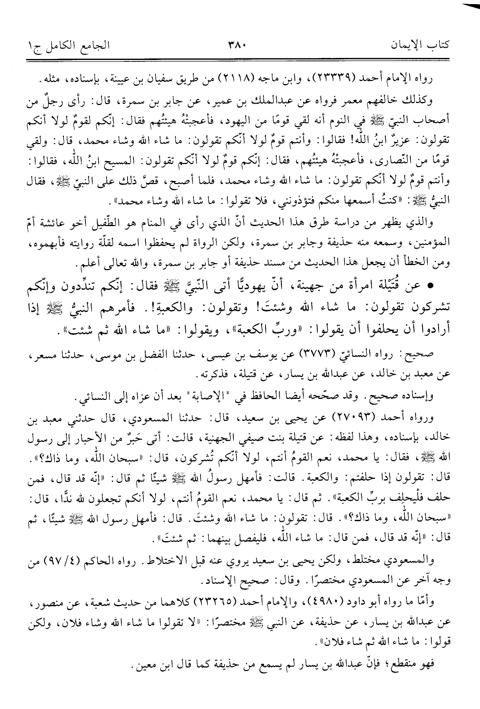ورواه أحمد (٢٧٠٩٣) عن يحيى بن سعيد، قال: حدثنا المسعودي، قال حدثني معبد بن خالد، بإسناده، وهذا لفظه: عن قتيلة بنت صيفي الجهنية، قالت: أتى حَبرٌ من الأحبار إلى رسول اللَّه -صلى اللَّه عليه وسلم-، فقال: يا محمد، نعم القومُ أنتم، لولا أنّكم تُشركون، قال: "سبحان اللَّه، وما ذاك؟ ". قال: تقولون إذا حلفتم: والكعبة. قالت: فأمهل رسولُ اللَّه -صلى اللَّه عليه وسلم- شيئًا ثم قال: "إنّه قد قال، فمن حلف فلْيحلِف بربِّ الكعبة". ثم قال: يا محمد، نعم القومُ أنتم، لولا أنكم تجعلون للَّه ندًّا، قال: "سبحان اللَّه، وما ذاك؟ ". قال: تقولون: ما شاء اللَّه وشئتَ. قال: فأمهل رسول اللَّه -صلى اللَّه عليه وسلم- شيئًا، ثم قال: "إنّه قد قال، فمن قال: ما شاء اللَّه، فليفصل بينهما: ثم شئتَ".