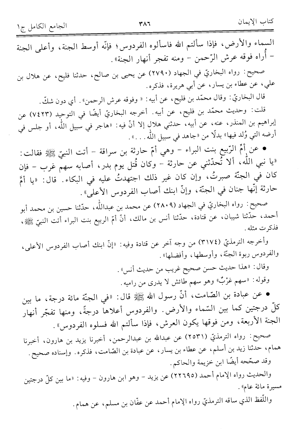 • عن عبادة بن الصّامت، أنّ رسول اللَّه -صلى اللَّه عليه وسلم- قال: "في الجنّة مائة درجة، ما بين كلّ درجتين كما بين السّماء والأرض، والفردوس أعلاها درجةً، ومنها تفجّر أنهار الجنة الأربعة، ومن فوقها يكون العرش، فإذا سألتم اللَّه فسلوه الفردوس".