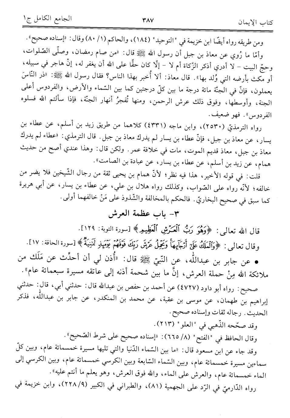 وأمّا ما رُوي عن معاذ بن جبل أنّ رسول اللَّه -صلى اللَّه عليه وسلم- قال: "من صام رمضان، وصلّى الصّلوات، وحجّ البيت -لا أدري أذكر الزّكاة أم لا- إلّا كان حقًّا على اللَّه أنّ يغفر له، إنْ هاجر في سبيله، أو مكث بأرضه التي وُلد بها". قال معاذ: ألا أُخبر بهذا الناس؟ فقال رسول اللَّه -صلى اللَّه عليه وسلم-: "ذر النّاسَ يعملون، فإنّ في الجنّة مائة درجة ما بين كلّ درجنين كما بين السّماء والأرض، والفردوس أعلى الجنة، وأوسطها، وفوق ذلك عرش الرحمن، ومنها تُفجرُ أنهار الجنّة، فإذا سألتم اللَّه فسلوه الفردوس". فهو ضعيف.