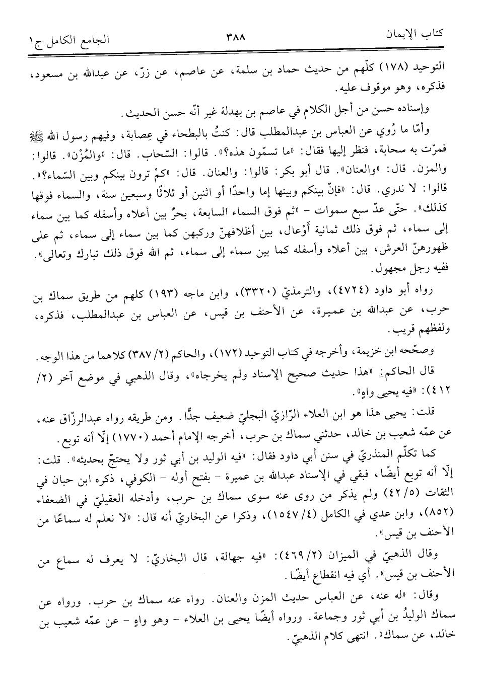 وأمّا ما رُوي عن العباس بن عبد المطلب قال: كنتُ بالبطحاء في عِصابة، وفيهم رسول اللَّه -صلى اللَّه عليه وسلم- فمرّت به سحابة، فنظر إليها فقال: ما تسمّون هذه؟ ". قالوا: السّحاب. قال: "والمُزْن". قالوا: والمزن. قال: "والعنان". قال أبو بكر: قالوا: والعنان. قال: "كم ترون بينكم وبين السّماء؟ ". قالوا: لا ندري. قال: "فإنّ بينكم وبينها إما واحدًا أو اثنين أو ثلاثًا وسبعين سنة، والسماء فوقها كذلك". حتّى عدّ سبع سموات - "ثم فوق السّماء السابعة، بحرٌ بين أعلاه وأسفله كما بين سماء إلى سماء، ثم فوق ذلك ثمانية أُوْعال، بين أظلافهنّ وركبهن كما بين سماء إلى سماء، ثم على ظهورهنّ العرش، بين أعلاه وأسفله كما بين سماء إلى سماء، ثم اللَّه فوق ذلك تبارك وتعالى". ففيه رجل مجهول.