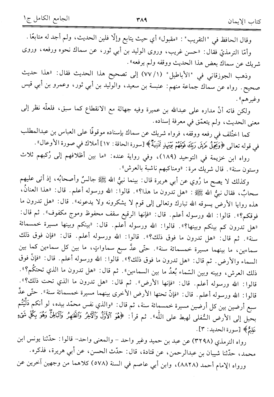 وكذلك لا يصح ما رُوي عن أبي هريرة قال: بينما نبيُّ اللَّه -صلى اللَّه عليه وسلم- جالسٌ وأصحابُه، إذ أتى عليهم سحابٌ، فقال نبيُّ اللَّه -صلى اللَّه عليه وسلم-: "هل تدرون ما هذا؟ ". قالوا: اللَّه ورسوله أعلم. قال: "هذا العنانُ، هذه رواية الأرض يسوقه اللَّه تبارك وتعالى إلى قوم لا يشكرونه ولا يدعونه". قال: "هل تدرون ما فوقكم؟ ". قالوا: اللَّه ورسوله أعلم. قال: "فإنها الرقيع سقف محفوظ وموج مكفوف". ثم قال: "هل تدرون كم بينكم وبينها؟ ". قالوا: اللَّه ورسوله أعلم. قال: بينكم وبينها مسيرة خمسمائة سنة". ثم قال: "هل تدرون ما فوق ذلك؟ ". قالوا: اللَّه ورسوله أعلم. قال: فإن فوق ذلك سماءين، ما بينهما مسيرة خمسمائة سنة. حتّى عدَّ سبع سماواتٍ، ما بين كل سماءين كما بين السماء والأرض. ثم قال: "هل تدرون ما فوق ذلك؟ ". قالوا: اللَّه ورسوله أعلم. قال: "فإنّ فوق ذلك العرش، وبينه وبين السّماء بُعدُ ما بين السماءين". ثم قال: "هل تدرون ما الذي تحتكُم؟ ". قالوا: اللَّه ورسوله أعلم. قال: "فإنها الأرض". ثم قال: "هل تدرون ما الذي تحت ذلك؟ ". قالوا: اللَّه ورسوله أعلم، قال: "فإنّ تحتها الأرض الأخرى بينهما مسيرة خمسمائة سنة". حتّى عدَّ سبع أرضين بين كل أرضين مسيرة خمسمائة سنة، ثم قال: "والذي نفس محمد بيده، لو أنكم دَلَّيْتُم بحبل إلى الأرض السُّفلى لهبط على اللَّه". ثم قرا: {هُوَ الْأَوَّلُ وَالْآخِرُ وَالظَّاهِرُ وَالْبَاطِنُ وَهُوَ بِكُلِّ شَيْءٍ عَلِيمٌ} [سورة الحديد: ٣].