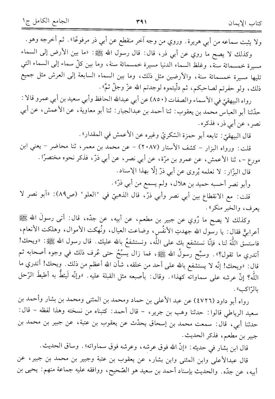 وكذلك لا يصح ما رُوي عن جبير بن مطعم، عن أبيه، عن جدّه، قال: أتى رسولَ اللَّه -صلى اللَّه عليه وسلم- أعرابيٌّ فقال: يا رسول اللَّه جهدتِ الأنفُس، وضاعت العيال، ونُهكت الأموال، وهلكت الأنعام، فاستق اللَّهَ لنا، فإنّا نستشفع بك على اللَّه، ونستشفعُ باللَّه عليك. قال رسول اللَّه -صلى اللَّه عليه وسلم-: "ويحك! أتدري ما تقول؟ ". وسبَّح رسول اللَّه -صلى اللَّه عليه وسلم-، فما زال يسبِّحُ حتى عُرف ذلك في وجوه أصحابه ثم قال: "ويحك! إنّه لا يستشفع باللَّه على أحد من خلقه، شأن اللَّه أعظم من ذلك. ويحك! أتدري ما اللَّه؟ إنّ عرشه على سماواته كهذا". وقال: بأصبعه مثل القبلة عليه. "وإنّه لَيئطُّ به أطيطَ الرّحل بالرّاكب".
