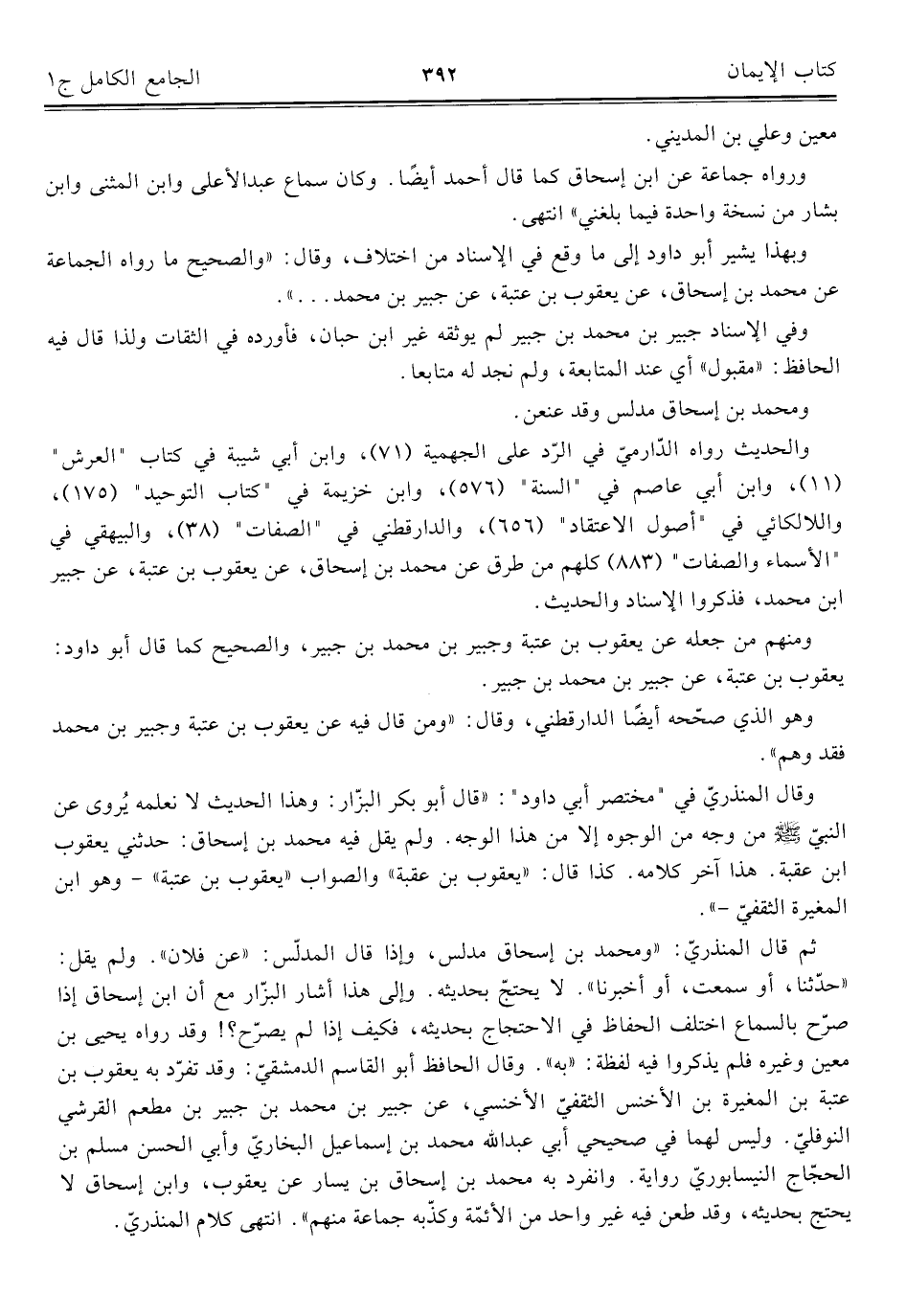 ثم قال المنذريّ: ومحمد بن إسحاق مدلس، وإذا قال المدلّس: "عن فلان"، ولم يقل: "حدّثنا، أو سمعت، أو أخبرنا". لا يحتجّ بحديثه. وإلى هذا أشار البزّار مع أن ابن إسحاق إذا صرّح بالسماع اختلف الحفاظ في الاحتجاج بحديثه، فكيف إذا لم يصرّح؟ ! وقد رواه يحيى بن معين وغيره فلم يذكروا فيه لفظة: "به". وقال الحافظ أبو القاسم الدمشقي: وقد تفرّد به يعقوب بن عتبة بن المغيرة بن الأخنس الثقفيّ الأخنسي، عن جبير بن محمد بن جبير بن مطعم القرشي النوفليّ، وليس لهما في صحيحي أبي عبد اللَّه محمد بن إسماعيل البخاريّ وأبي الحسن مسلم بن الحجّاج النيسابوريّ رواية، وانفرد به محمد بن اسحاق بن يسار عن يعقوب، وابن إسحاق لا يحتج بحديثه، وقد طعن فيه غير واحد من الأئمّة وكذّبه جماعة منهم". انتهى كلام المنذريّ.