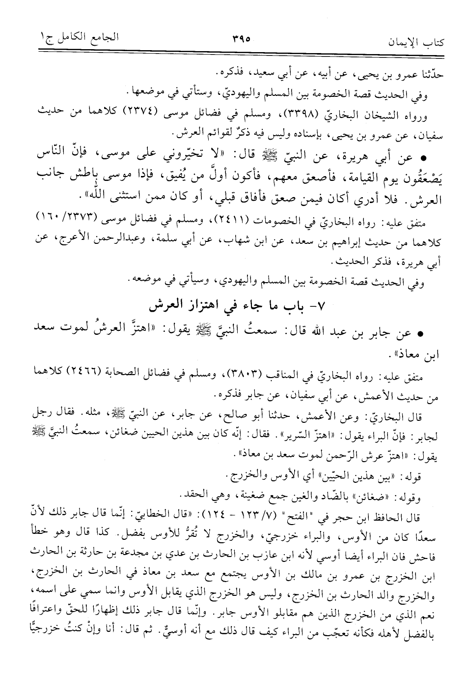 قال البخاريّ: وعن الأعمش، حدّثنا أبو صالح، عن جابر، عن النبيّ -صلى اللَّه عليه وسلم-، مثله. فقال رجل الجابر: فإنّ البراء يقول: "اهتزّ السّرير". فقال: إنّه كان بين هذين الحيين ضغائن، سمعتُ النبيَّ -صلى اللَّه عليه وسلم- يقول: "اهتزّ عرش الرّحمن لموت سعد بن معاذ".