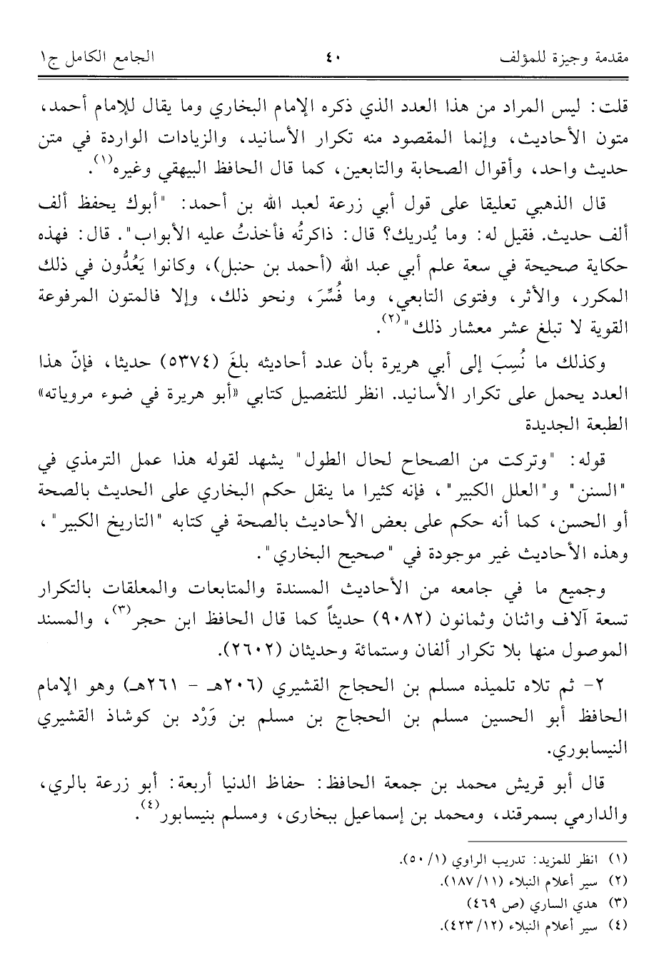 وكذلك ما نُسِبَ إلى أبي هريرة بأن عدد أحاديثه بلغَ (٥٣٧٤) حديثًا، فإنَّ هذا العدد يحمل على تكرار الأسانيد. انظر للتفصيل كتابي "أبو هريرة في ضوء مروياته" الطبعة الجديدة.