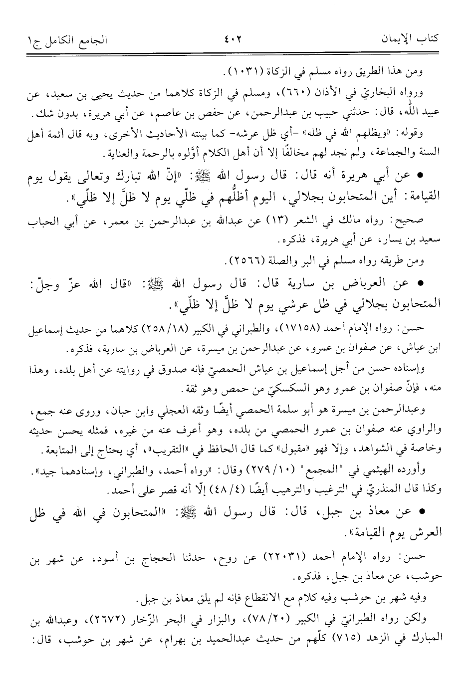 • عن العرباض بن سارية قال: قال رسول اللَّه -صلى اللَّه عليه وسلم-: "قال اللَّه عزّ وجلّ: المتحابون بجلالي في ظل عرشي يوم لا ظلَّ إلا ظلّي".
