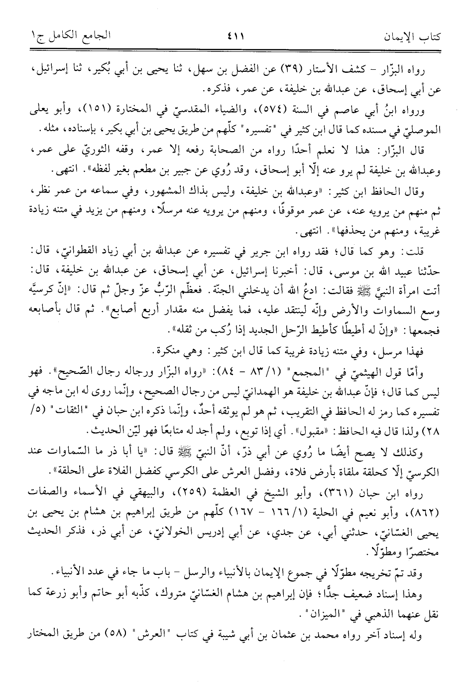 قلت: وهو كما قال؛ فقد رواه ابن جرير في تفسيره عن عبد اللَّه بن أبي زياد القطوانيّ، قال: حدثنا عبد اللَّه بن موسى، قال: أخبرنا إسرائيل، عن أبي إسحاق، عن عبد اللَّه بن خليفة، قال: أتت امرأة النبيَّ -صلى اللَّه عليه وسلم- فقالت: ادعُ اللَّه أن يدخلني الجنّة. فعظّم الرّبُّ عزّ وجلّ ثم قال: "إنّ كرسيَّه وسع السماوات والأرض وإنّه لينتقد عليه، فما يفضل منه مقدار أربع أصابع". ثم قال بأصابعه فجمعها: "وإن له أطيطًا كأطيط الرّحل الجديد إذا رُكب من ثقله".