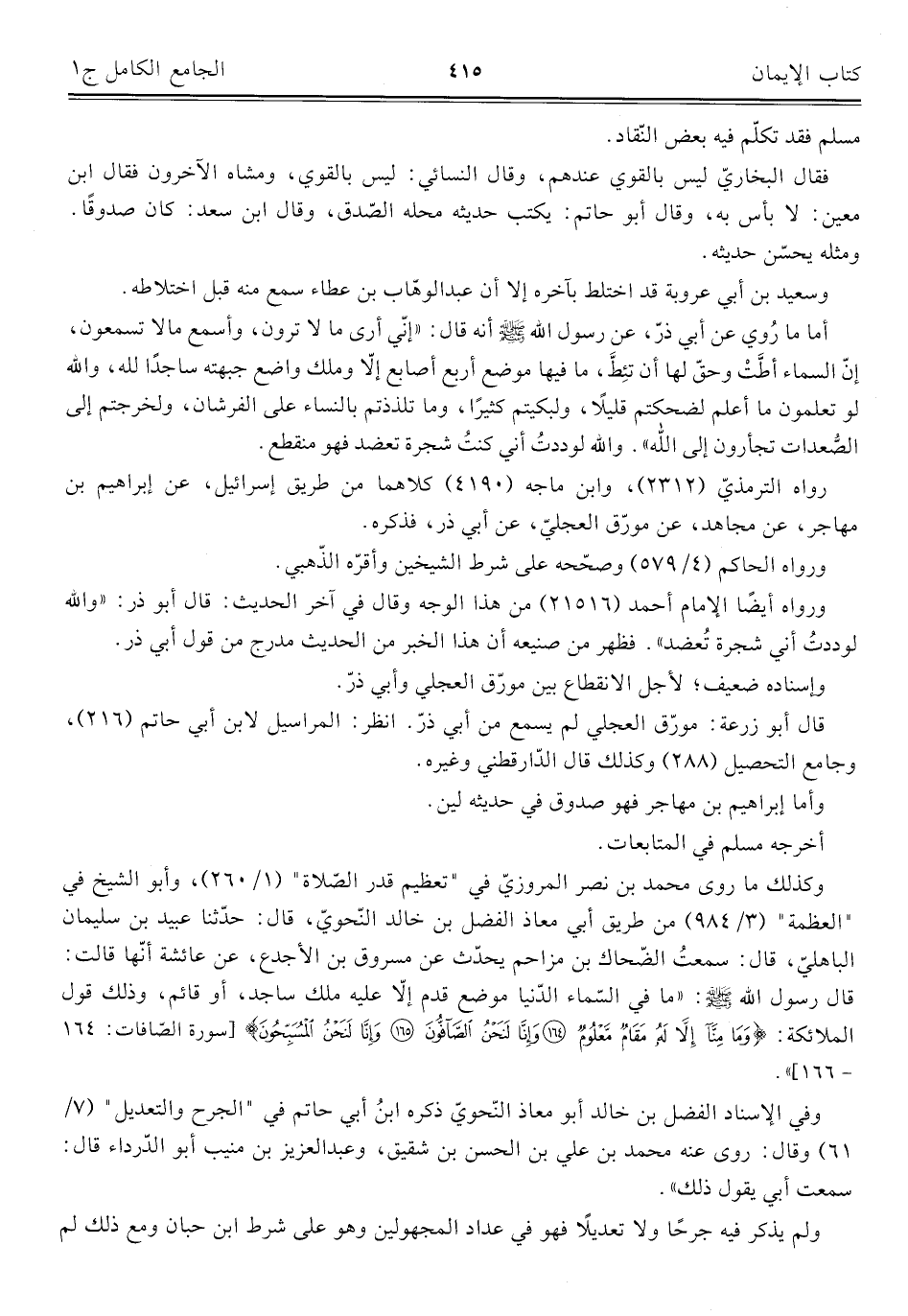 أما ما رُوي عن أبي ذرّ، عن رسول اللَّه -صلى اللَّه عليه وسلم-: أنه قال: "إني أرى ما لا ترون، وأسمع ما لا تسمعون، إنّ السماء أطَّتْ وحّق لها أن تئِطَّ، ما فيها موضع أربع أصابع إلّا وملك واضع جبهته ساجدًا للَّه، واللَّه لو تعلمون ما أعلم لضحكتم قليلًا، ولبكيتم كثيرًا، وما تلذذتم بالنساء على الفرشان، ولخرجتم إلى الصُّعدات تجأرون إلى اللَّه". واللَّه لوددتُ أني كنتُ شجرة تعضد فهو منقطع.