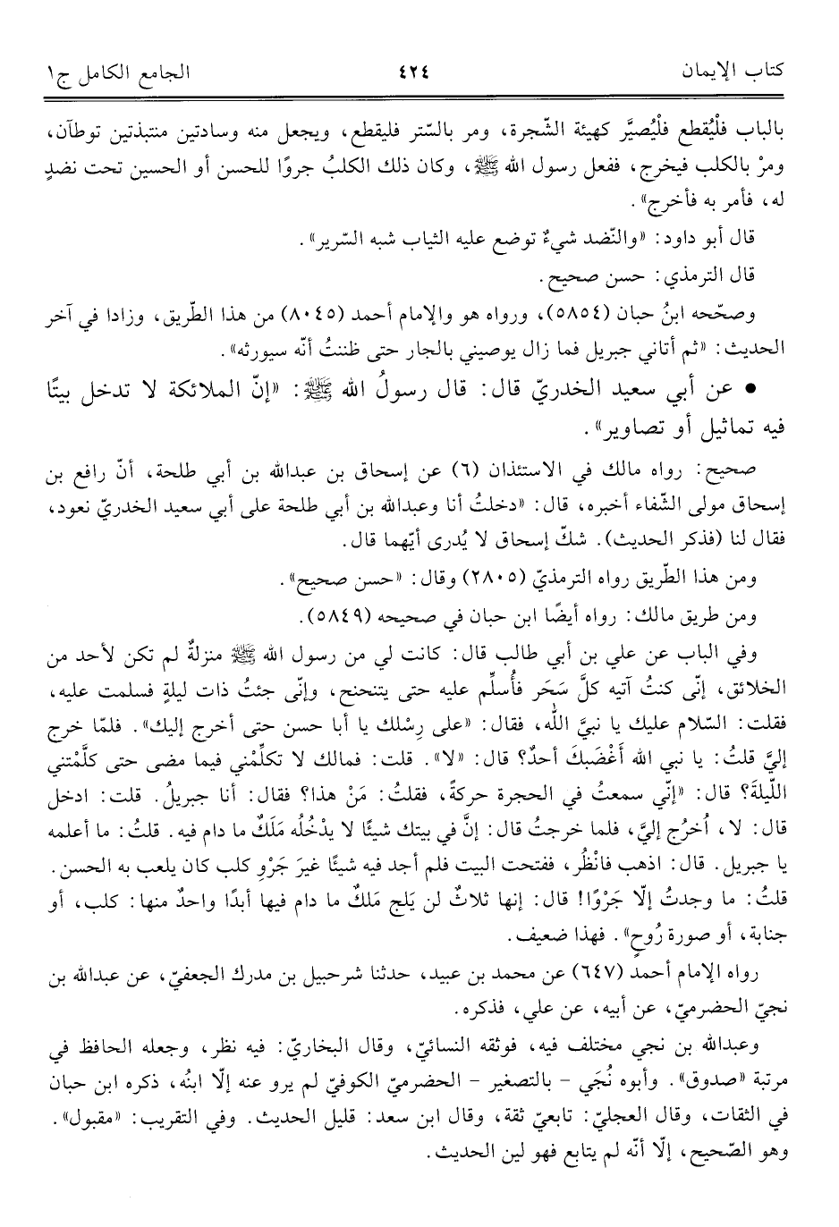 وفي الباب عن علي بن أبي طالب قال: كانت لي من رسول اللَّه -صلى اللَّه عليه وسلم- منزلةٌ لم تكن لأحد من الخلائق، إنّى كنتُ آتيه كلَّ سَحَر فأُسلِّم عليه حتى يتنحنح، وإنّي جئتُ ذات ليلةٍ فسلمت عليه، فقلت: السّلام عليك يا نبيَّ اللَّه، فقال: "على رِسْلك يا أبا حسن حتى أخرج إليك". فلمّا خرج إليَّ قلتُ: يا نبي اللَّه أَغْضَبكَ أحدٌ؟ قال: "لا". قلت: فمالك لا تكلِّمْني فيما مضى حتى كلَّمْتني اللّيلةَ؟ قال: "إنّي سمعتُ في الحجرة حركةٌ، فقلتُ: مَنْ هذا؟ فقال: أنا جبريلُ. قلت: ادخل قال: لا، أُخرُج إليَّ، فلما خرجتُ قال: إنَّ في بيتك شيئًا لا يدْخُلُه مَلَكٌ ما دام فيه. قلتُ: ما أعلمه يا جبريل. قال: اذهب فانْظُر، ففتحت البيت فلم أجد فيه شيئًا غيرَ جَرْوِ كلب كان يلعب به الحسن. قلتُ: ما وجدتُ إلّا جَرْوَا! قال: إنها ثلاثٌ لن يَلج مَلكٌ ما دام فيها أبدًا واحدٌ منها: كلب، أو جنابة، أو صورة رُوحٍ". فهذا ضعيف.