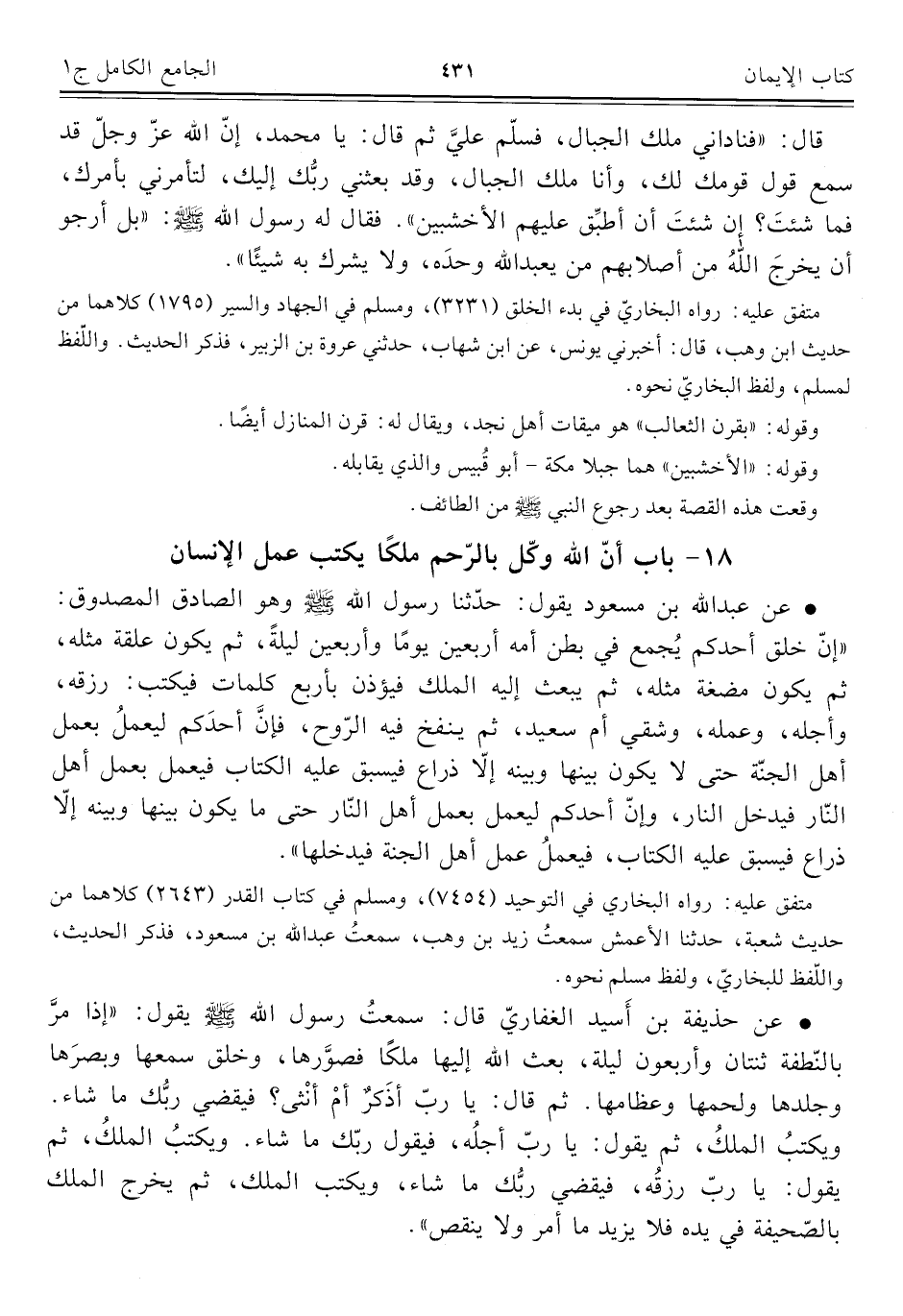 • عن عبد اللَّه بن مسعود يقول: حدّثنا رسول اللَّه -صلى اللَّه عليه وسلم- وهو الصادق المصدوق: "إنّ خلق أحدكم يُجمع في بطن أمه أربعين يومًا وأربعين ليلةً، ثم يكون علقة مثله، ثم يكون مضغة مثله، ثم يبعث إليه الملك فيؤذن بأربع كلمات فيكتب: رزقه، وأجله، وعمله، وشقي أم سعيد، ثم ينفخ فيه الرّوح، فإنّ أحدَكم ليعملُ بعمل أهل الجنّة حتى لا يكون بينها وبينه إلّا ذراع فيسبق عليه الكتاب فيعمل بعمل أهل النّار فيدخل النار، وإنّ أحدكم ليعمل بعمل أهل النّار حتى ما يكون بينها وبينه إلّا ذراع فيسبق عليه الكتاب، فيعملُ عمل أهل الجنة فيدخلها".