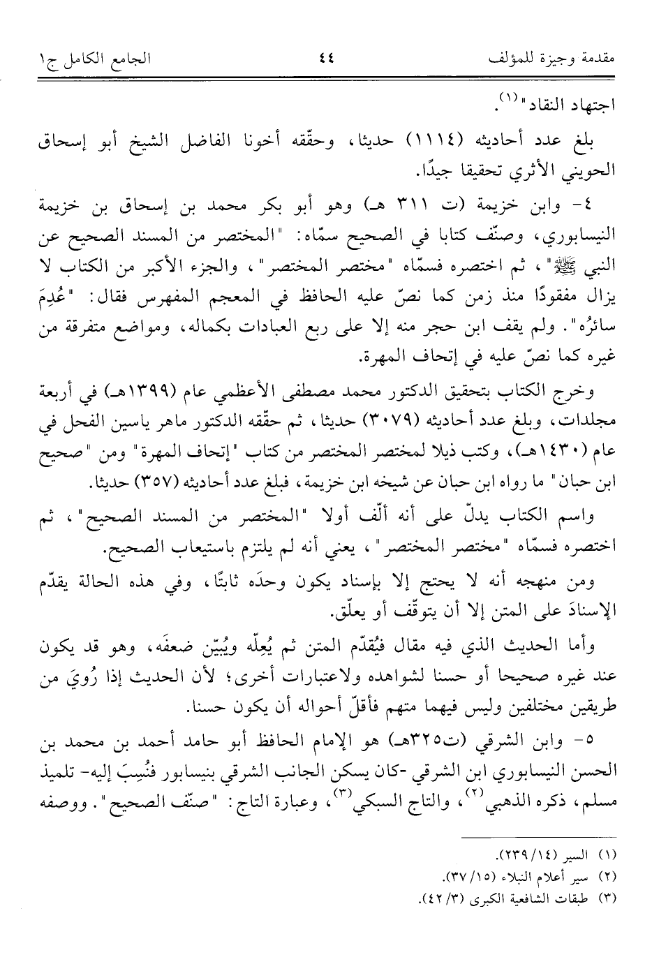 ٤ - وابن خزيمة (ت ٣١١ هـ) وهو أبو بكر محمد بن إسحاق بن خزيمة النيسابوري، وصنّف كتابا في الصحيح سمّاه: "المختصر من المسند الصحيح عن النبي -صلى اللَّه عليه وسلم-"، ثم اختصره فسمّاه "مختصر المختصر"، والجزء الأكبر من الكتاب لا يزال مفقودًا منذ زمن كما نصّ عليه الحافظ في المعجم المفهرس فقال: "عُدِمَ سائرُه". ولم يقف ابن حجر منه إلا على ربع العبادات بكماله، ومواضع متفرقة من غيره كما نصّ عليه في إتحاف المهرة.