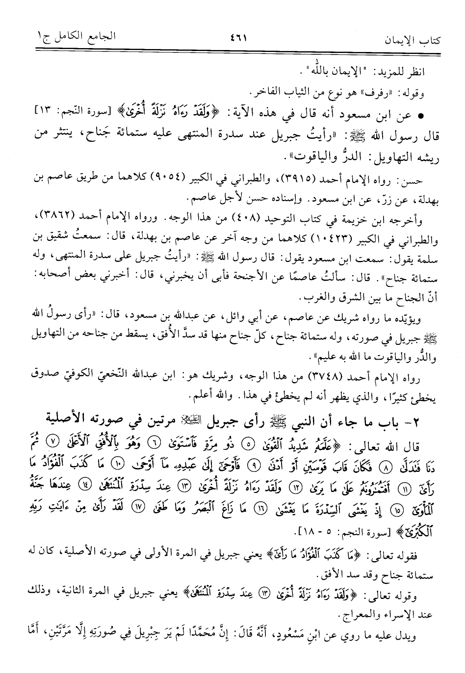 ويؤيّده ما رواه شريك عن عاصم، عن أبي وائل، عن عبد اللَّه بن مسعود، قال: "رأى رسولُ اللَّه -صلى اللَّه عليه وسلم- جبريل في صورته، وله ستمائة جناح، كلّ جناح منها قد سدَّ الأُفق، يسقط من جناحه من التهاويل والدُّر والياقوت ما اللَّه به عليم".