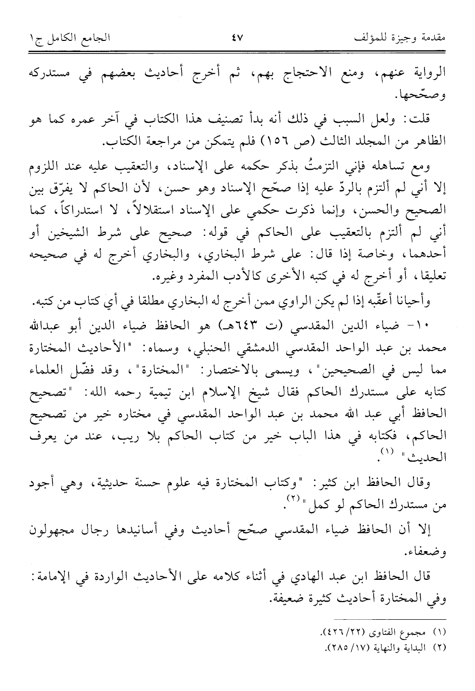 وقال الحافظ ابن كثير: "وكتاب المختارة فيه علوم حسنة حديثية، وهي أجود من مستدرك الحاكم لو كمل" (¬٢).