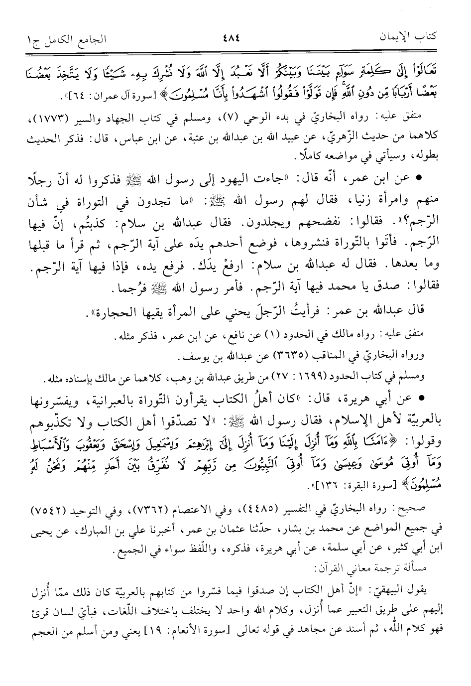 • عن ابن عمر، أنّه قال: "جاءت اليهود إلى رسول اللَّه -صلى اللَّه عليه وسلم- فذكروا له أنّ رجلًا منهم وامرأة زنيا، فقال لهم رسول اللَّه -صلى اللَّه عليه وسلم-: "ما تجدون في التوراة في شأن الرّجم؟ ". فقالوا: نفضحهم ويجلدون. فقال عبد اللَّه بن سلام: كذبتُم، إنّ فيها الرّجم. فأتَوا بالتّوراة فنشروها، فوضع أحدهم يدَه على آية الرّجم، ثم قرأ ما قبلها وما بعدها. فقال له عبد اللَّه بن سلام: ارفعْ يدَك. فرفع يده، فإذا فيها آية الرّجم. فقالوا: صدق يا محمد فيها آية الرّجم. فأمر رسول اللَّه -صلى اللَّه عليه وسلم- فرُجما.