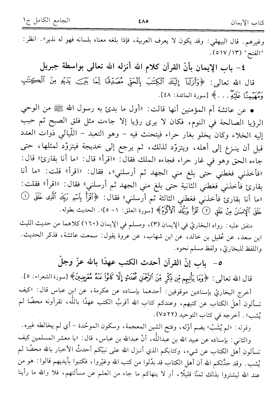 ٤ - باب الإيمان بأنّ القرآن كلام اللَّه أنزله اللَّه تعالى بواسطة جبريل
