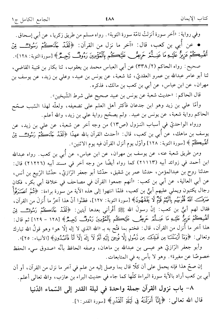 ومن طريق شعبة عنه، عن يوسف بن مهران، عن ابن عباس، عن أُبي بن كعب. رواه عبد اللَّه ابن أحمد في زوائد أبيه (٢١١١٣) كما رواه أيضًا من وجه آخر في مسند أبيه (٢١٢٢٦) قال: حدثنا روح بن عبد المؤمن، حدثنا عمر بن شقيق، حدّثنا أبو جعفر الرّازيّ، حدّثنا الرّبيع بن أنس، عن أبي العالية، عن أبي بن كعب: "أنهم جمعوا القرآن في مصاحف في خلافة أبي بكر، فكان رجال يكتبون ويملي عليهم أبيُّ بن كعب، فلمّا انتهوا إلى هذه الآية من سورة براءة: {ثُمَّ انْصَرَفُوا صَرَفَ اللَّهُ قُلُوبَهُمْ بِأَنَّهُمْ قَوْمٌ لَا يَفْقَهُونَ} [سورة التوبة: ١٢٧]، فظنّوا أنّ هذا آخرُ ما أُنزلَ من القرآن، فقال لهم أبيُّ بن كعب: إنّ رسولَ اللَّه -صلى اللَّه عليه وسلم- أَقْرأني بعدها آيتين: {لَقَدْ جَاءَكُمْ رَسُولٌ مِنْ أَنْفُسِكُمْ عَزِيزٌ عَلَيْهِ مَاعَنِتُّمْ حَرِيصٌ عَلَيْكُمْ بِالْمُؤْمِنِينَ رَءُوفٌ رَحِيمٌ} [سورة التوبة: ١٢٨ - ١٢٩] ثم قال: هذا آخر ما أُنزل من القرآن، قال: فختم بما فتُح به بـ"اللَّه الذي لا إله إلّا هو" وهو قولُ اللَّه تبارك وتعالى: {وَمَا أَرْسَلْنَا مِنْ قَبْلِكَ مِنْ رَسُولٍ إِلَّا نُوحِي إِلَيْهِ أَنَّهُ لَا إِلَهَ إِلَّا أَنَا فَاعْبُدُونِ} [الأنبياء: ٢٥] ".