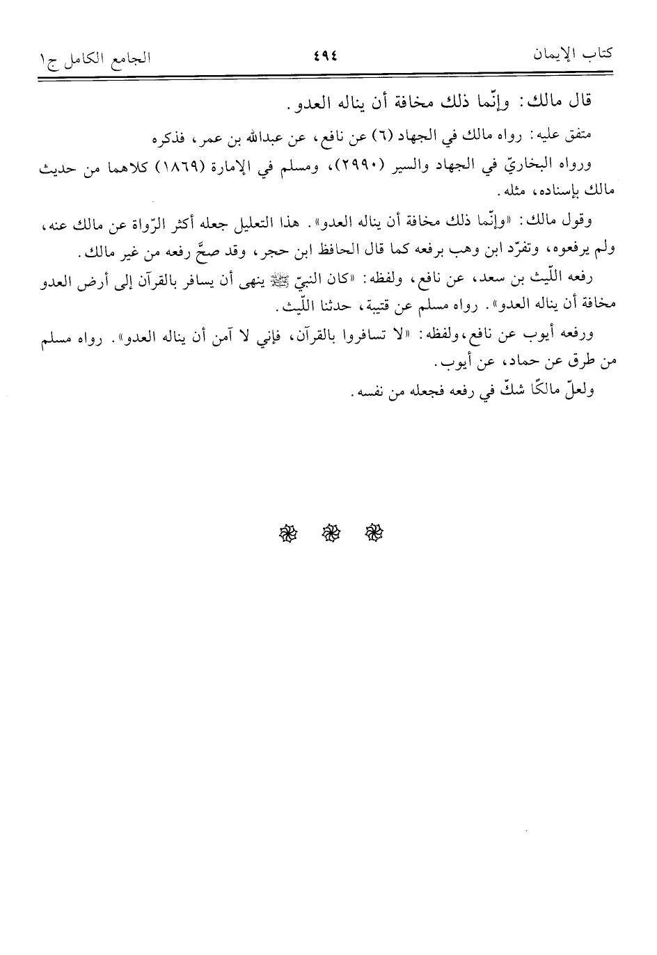 ورفعه أيوب عن نافع، ولفظه: "لا تسافروا بالقرآن، فإني لا آمن أن يناله العدو". رواه مسلم من طرق عن حماد، عن أيوب.