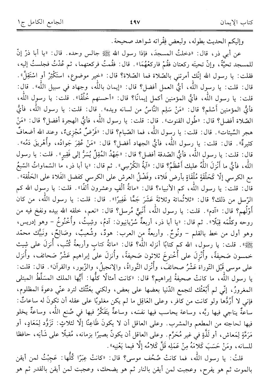 عن أبي ذر، قال: "دخلتُ المسجدَ، فإذا رسول اللَّه -صلى اللَّه عليه وسلم- جالس وحده. قال: "يا أبا ذرّ إنّ للمسجد تحيَّةً، وإنّ تحيتَه ركعتان فقُمْ فاركعْهُمَا". قال: فقُمتُ فركعتهما، ثم عُدْتُ فجلستُ إليه، فقلت: يا رسول اللَّه إنّك أمرتني بالصّلاة فما الصّلاة؟ قال: "خير موضوع، استَكْثِرْ أو اسْتَقِلَّ". قال: قلت: يا رسول اللَّه، أيُّ العمل أفضل؟ قال: "إيمان باللَّه، وجهاد في سبيل اللَّه". قال: قلت: يا رسول اللَّه، فأيُّ المؤمنين أكمل إيمانًا؟ قال: "أحسنهم خُلْقًا". فقلت: يا رسول اللَّه، فأيُّ المؤمنين أَسْلم؟ قال: "مَنْ سَلِم النَّاسُ من لسانه ويده". قال: قلت: يا رسول اللَّه، فأيُّ الصّلاة أفضل؟ قال: "طُول القنوت". قال: قلت: يا رسول اللَّه، فأيُّ الهجرة أفضل؟ قال: "مَنْ هجر السِّيئات". قال: قلت: يا رسول اللَّه، فما الصّيام؟ قال: "فَرْضٌ مُجْزِئٌ، وعند اللَّه أضعافٌ كثيرةٌ". قال: قلت: يا رسول اللَّه، فأيُّ الجهاد أفضل؟ قال: "مَنْ عُقِرَ جَوادُه، وأُهْريقَ دَمُه". قال: قلت: يا رسول اللَّه، فأيُّ الصدقة أفضل؟ قال: "جَهْدُ المُقِل يُسَرُّ إلى فَقِيرٍ". قلت: يا رسول اللَّه، فأيُّ ما أَنْزلَ اللَّهُ عليك أَعْظَمُ؟ قال: "آيةُ الكُرْسِي". ثم قال: يا أبا ذر، ما السّماواتُ السّبعُ مع الكرسي إلّا كَحَلْقَةِ مُلْقَاةٍ بأرض فَلاة، وفَضْلُ العرش على الكرسي كفضل الفَلاة على الحَلْقة". قال: قلت: يا رسول اللَّه، كم الأنبياء؟ قال: "مائةُ ألْفٍ وعشرون ألفًا". قلت: يا رسول اللَّه كم الرّسل من ذلك؟ قال: "ثلاثُمائة وثلاثةَ عَشَرَ جَمًّا غَفِيرًا". قال: قلت: يا رسول اللَّه، من كان أوّلُهم؟ قال: "آدم". قلت: يا رسول اللَّه، أَنَبيٌّ مُرسل؟ قال: "نعم، خلقه اللَّه بيده ونفخ فيه من روحه وكلَّمَه قِبَلًا". ثم قال: يا أبا ذر، أربعةٌ سُرْيانِيون: آدمُ، وشِيثُ، وأُخْنُوخُ -وهو إدريس، وهو أول من خط بالقلم- ونُوحٌ. وأربعةٌ من العرب: هودٌ، وشُعيبٌ، وصَالِحٌ، ونَبيُّك محمّد -صلى اللَّه عليه وسلم-". قلت: يا رسول اللَّه كم كتابًا أنزله اللَّه؟ قال: "مائةُ كتابٍ وأربعةُ كُتُب، أُنزلَ على شِيث خمسون صَحيفةً، وأُنْزِلَ على أُخْنوخَ ثلاثون صَحيفةً، وأُنزلَ على إبراهيم عَشْرُ صَحائف، وأُنزل على موسى قَبْل التّوراة عَشْرُ صحائفَ، وأُنْزل التَّوراة والإنجيلُ، والزّبور، والقرآن". قال: قلت: يا رسول اللَّه، ما كانتْ صحيفةُ إبراهيم؟ قال: "كانت أمثالًا كلُّها: أَيُّها الملك المسَلَّطُ المبتلى المغرورُ، إنّي لم أَبْعَثْك لتجمع الدّنيا بعضها على بعض، ولكني بعَثْتُك لترد عنْي دعوةَ المظلوم، فإني لا أَرُدُّها ولو كانت من كافر، وعلى العَاقِل ما لم يكن مغلوبًا على عقله أن تكونَ له ساعاتٌ: ساعةٌ يناجي فيها ربَّه، وساعة يحاسب فيها نفسَه، وساعةٌ يَتَفَكَّرُ فيها في صُنع اللَّه، وساعةٌ يخلو فيها لحاجته من المطعم والمشرب. وعلى العاقل أن لا يكونَ ظَاعِنًا إلّا لثلاثٍ: تَزَوُّد لِمَعَادٍ، أو مَرَمَّةٍ لِمَعاش، أو لَذَّةٍ في غير مُحَرَّم. وعلى العاقل أن يكون بصيرًا بزمانه، مُقبلًا على شَأنِه، حافظا للسانه، ومَنْ حَسَبَ كَلامَهُ مِنْ عَمَلِه قَلَّ كَلامُه إلَّا فيما يَعْنِيه".