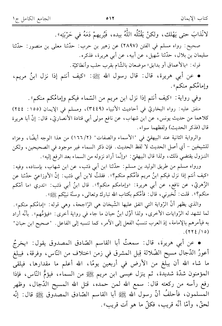 ورواه مسلم من طريق الوليد بن مسلم: حدّثنا ابن أبي ذئب، عن ابن شهاب، بإسناده، وفيه: "كيف أنتم إذا نزل فيكم ابنُ مريم فأمَّكم منكم؟ ". فقل لابن أبي ذئب: إنّ الأوزاعيّ حدثنا عن الزّهريّ، عن نافع، عن أبي هريرة: "وإمامكم منكم؟ ". قال ابنُ أبي ذئب: "تدري ما أمّكم منكم؟ ". قلت: تُخبرني، قال: فأمَّكم بكتاب اللَّه تبارك وتعالى، وسنَّة نبيّكم -صلى اللَّه عليه وسلم- ".