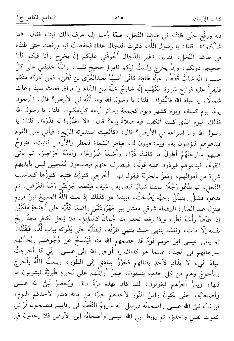 فيه ورفّع حتّى ظننّاه في طائفة النّخل، فلمّا رُحنا إليه عرف ذلك فينا، فقال: "ما شأنُكم؟ ". قلنا: يا رسول اللَّه، ذكرتَ الدّجال غداة فخفضتَ فيه ورفعت حتى ظننّاه في طائفة النّخل، فقال: "غير الدّجال أَخْوفَني عليكم إنْ يخرج وأنا فيكم فأنا حجيجه دونكم، وإنْ يخرج ولستُ فيكم فامرؤ حجيج نفسِه، واللَّهُ خليفتي على كلِّ مسلم؛ إنّه شابٌّ قَطَطٌ، عينُه طافِئة كأنّي أشبهُهُ بعبد العُزّي بن قَطَن، فمن أدركه منكم فليقرأُ عليه فواتِحَ سُورةِ الكَهْفِ إنّه خارجٌ خلّة بين الشّام والعراق فعاث يمينًا وعاث شمالًا، يا عباد اللَّه فاثْبُتُوا". قلنا: يا رسول اللَّه وما لَبْثُه في الأرض؟ قال: "أربعون يومًا يوم كسنة، ويوم كشهر ويوم كجمعة وسائر أيامه كأيامكم". قلنا: يا رسولَ اللَّه فذلك اليوم الذي كسنة أتكفِينا فيه صلاةُ يومٍ؟ قال: "لا اقدُرُوا له قدْرَه". قلنا: يا رسول اللَّه وما إسراعه في الأرض؟ قال: "كالغيث استدبرته الرّيح، فيأتي على القوم فيدعوهم فيؤمنون به، ويستجيبون له، فيأمر السّماءً فتمطر والأرض فتنبت، فتروحُ عليهم سارحَتَهُمْ أطولَ ما كانتْ ذُرًا، وأَسْبغَهُ ضُرُوعًا، وأمدّهُ خَوَاصِرَ، ثم يأتي القومَ، فيدعوهم فيردّون عليه قولَه، فينصرف عنهم فيصبحون مُمْحِلِين ليس بأيديهم شيءٌ من أموالهم، ويَمرُّ بالخَرِبَة فيقول لها: أخْرجِي كنوزَك فتتبعه كنوزُها كيعاسِيب النّحلِ، ثم يدْعُو رَجُلًا ممتلئًا شبابًا فيضربه بالسّيف فيقطعه جَزِلَتَيْن رَمْيةَ الغَرَضِ. ثم يدعوه فيقبلُ ويتهلّلُ وجهُه يَضْحَكُ، فبينما هو كذلك إذ بعث اللَّهُ المسيحَ ابنَ مريم فينزل عند المنارة البيضاء شرقي دمشق بين مَهْرُودَتَيْنِ واضعًا كَفَّيْه على أَجنحةِ مَلَكَيْنِ إذا طأطأَ رأْسَهُ قَطَر، وإذا رفعه تحدر منه جُمانٌ كاللُّؤلُؤِ، فلا يَحل لكافرٍ يجدُ ريحَ نفسه إِلَّا مات، ونفسُه ينتهي حيث ينتهي طرْفُه، فيطلُبُه حتّى يُدْركَه بباب لُدٍّ، فَيَقْتُلَه. ثم يأتي عيسى ابنَ مريم قومٌ قد عصمهم اللَّه منه فَيَمْسحُ عن وُجُوههم ويُحدِّثهم بدرجَاتِهم في الجنّة، فبينما هو كذلك إذ أوحى اللَّه إلى عيسى: إنّي قد أخرجتُ عبادًا لي، لا يَدانِ لأحدٍ بقتالهم فحَرِّزْ عِبادي إلى الطُّور، ويبعثُ اللَّه يأجوجَ ومأجوجَ وهم من كل حدب ينسلون، فيمرُّ أَوائِلُهم على بُحيرةِ طَبَريَّةَ فيشربون ما فيها، ويمرُّ آخرهم فيقولون: لقد كان بهذه مرَّةً ماءٌ. ويُحصرُ نَبِيُّ اللَّه عيسى وأصحابُه، حتّى يكونَ رأسُ الثّور لأحدهم خيرًا من مائة دينار لأحدكم اليوم، فيرغبُ نبيُّ اللَّه عيسى وأصحابُه فيرسل اللَّه عليهمُ النَّغَفَ في رقابِهم فيصبحون فَرْسَى كموت نفسٍ واحدةٍ، ثم يهبط نبي اللَّه عيسى وأصحابُه إلى الأرض فلا يجدون في