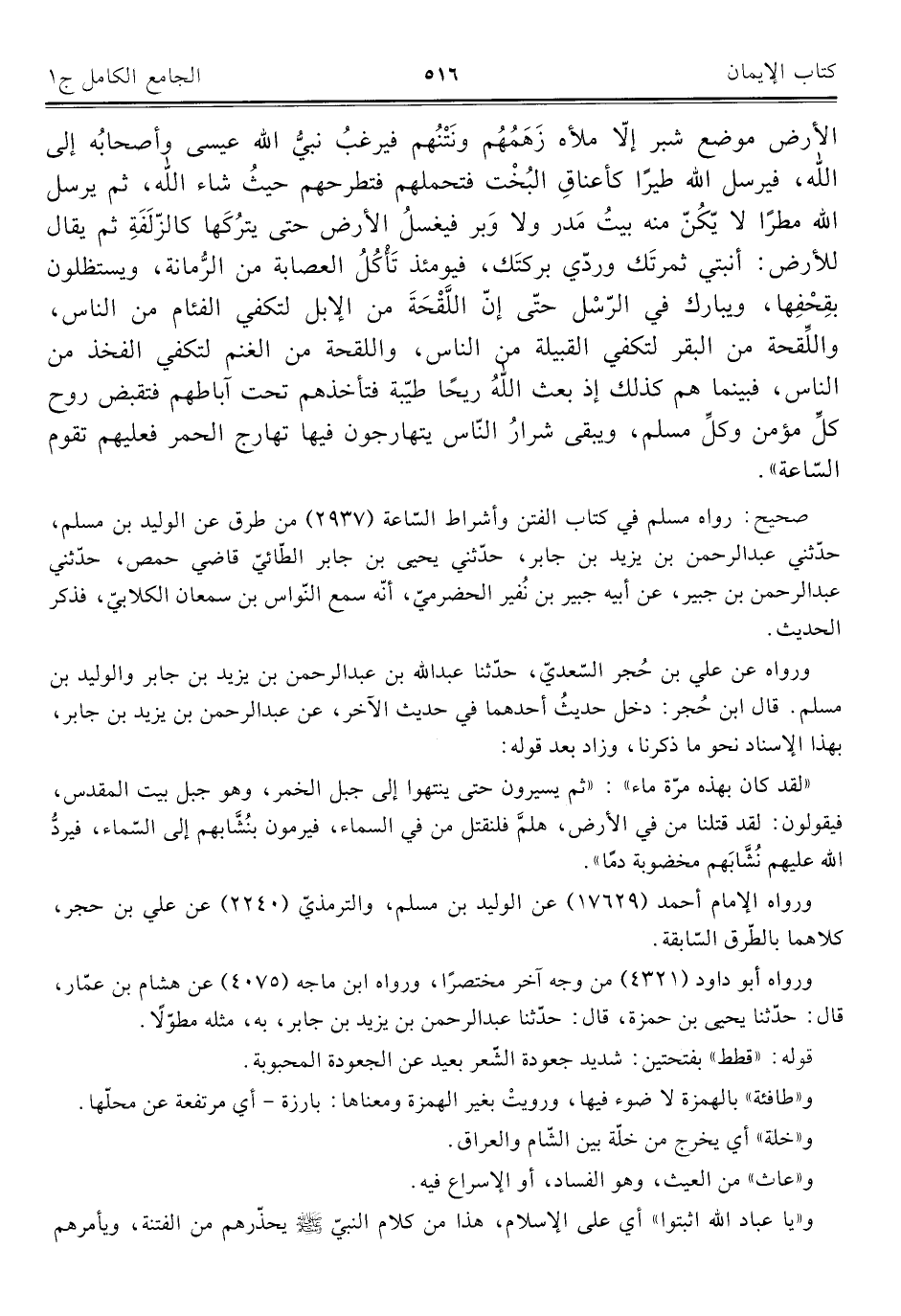 الأرض موضع شبر إِلَّا ملأه زَهَمُهُم ونَتْنُهم فيرغبُ نبيُّ اللَّه عيسى وأصحابُه إلى اللَّه، فيرسل اللَّه طيرًا كأعناقِ البُخْت فتحملهم فتطرحهم حيثُ شاء اللَّه، ثم يرسل اللَّه مطرًا لا يَكُنّ منه بيتُ مَدر ولا وَبر فيغسلُ الأرض حتى يترُكَها كالزَّلَفَةِ ثم يقال للأرض: أنبتي ثمرتَك وردّي بركتَك، فيومئذ تَأْكُلُ العصابة من الرُّمانة، ويستظلون بقِحْفِها، ويبارك في الرّسْل حتّى إنّ اللَّقْحَةَ من الإبل لتكفي الفئام من الناس، واللِّقحة من البقر لتكفي القبيلة من الناس، واللقحة من الغنم لتكفي الفخذ من الناس، فبينما هم كذلك إذ بعث اللَّهُ ريحًا طيّبة فتأخذهم تحت آباطهم فتقبض روح كلِّ مؤمن وكلِّ مسلم، ويبقى شرارُ النّاس يتهارجون فيها تهارج الحمر فعليهم تقوم السّاعة".