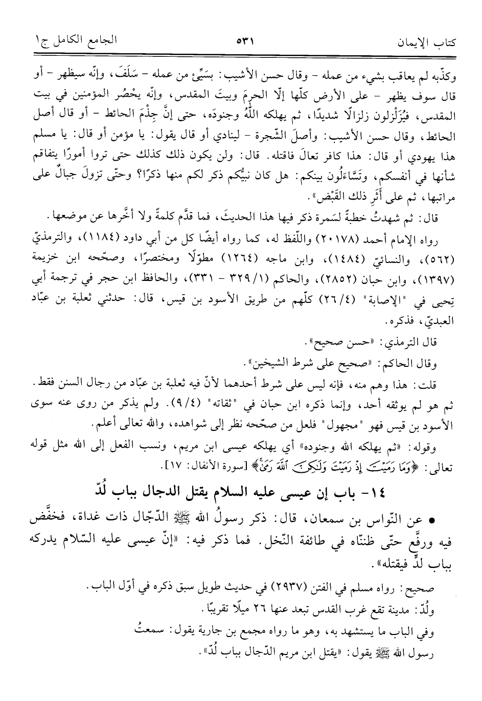 • عن النّواس بن سمعان، قال: ذكر رسولُ اللَّه -صلى اللَّه عليه وسلم- الدّجّال ذات غداة، فخفَّض فيه ورفَّع حتّى ظننّاه في طائفة النّخل. فما ذكر فيه: "إنّ عيسى عليه السّلام يدركهـ باب لدٍّ فيقتله".