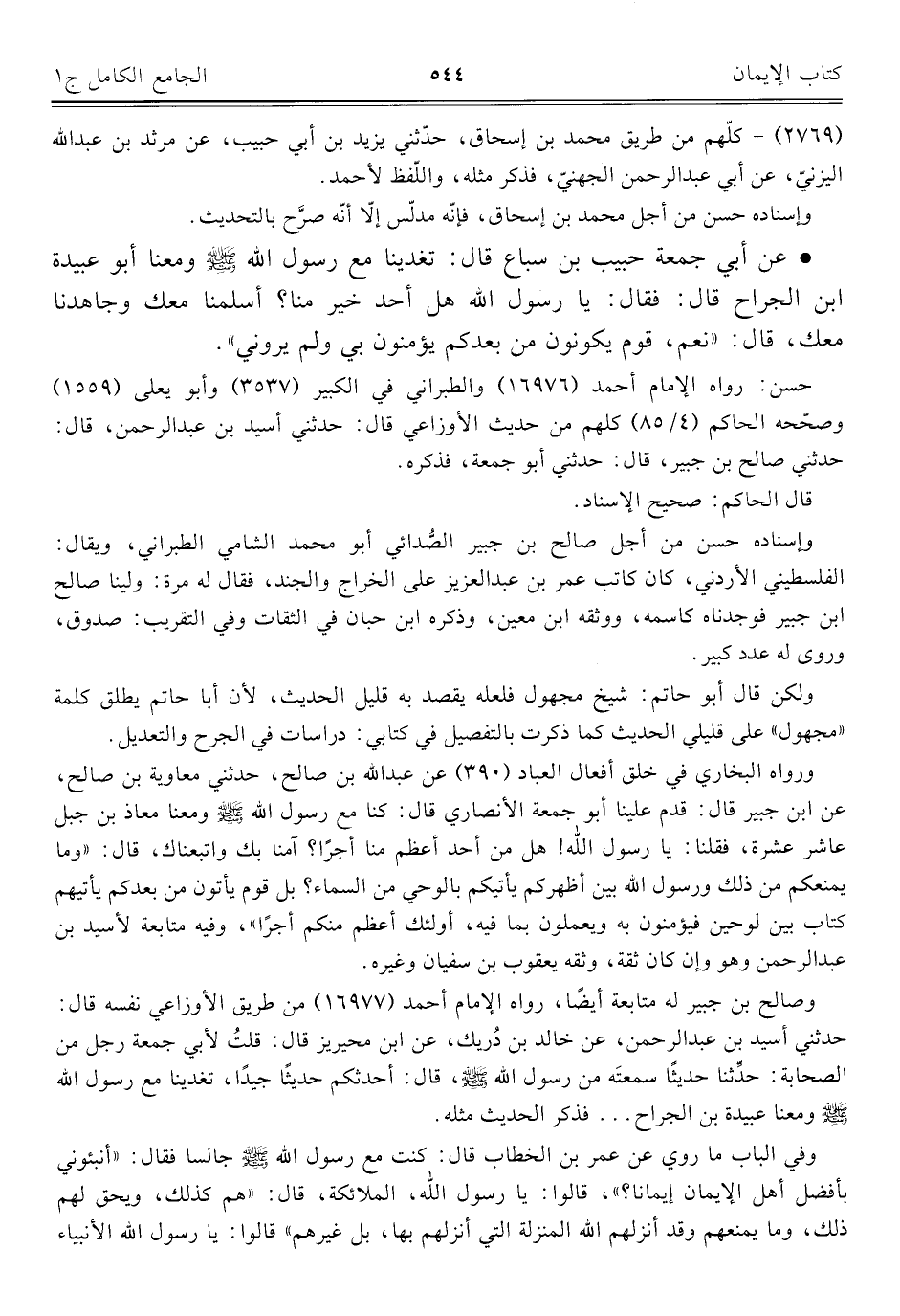 ورواه البخاري في خلق أفعال العباد (٣٩٠) عن عبد اللَّه بن صالح، حدثني معاوية بن صالح، عن ابن جبير قال: قدم علينا أبو جمعة الأنصاري قال: كنا مع رسول اللَّه -صلى اللَّه عليه وسلم- ومعنا معاذ بن جبل عاشر عشرة، فقلنا: يا رسول اللَّه! هل من أحد أعظم منا أجرًا؟ آمنا بك واتبعناك، قال: "وما يمنعكم من ذلك ورسول اللَّه بين أظهركم يأتيكم بالوحي من السماء؟ بل قوم يأتون من بعدكم يأتيهم كتاب بين لوحين فيؤمنون به ويعملون بما فيه، أولئك أعظم منكم أجرًا"، وفيه متابعة لأسيد بن عبد الرحمن وهو وإن كان ثقة، وثقه يعقوب بن سفيان وغيره.
