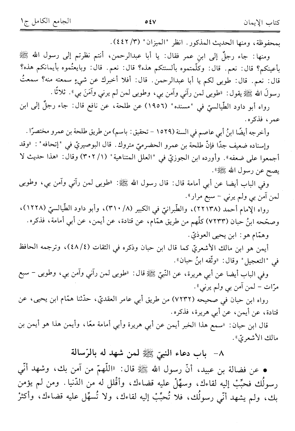 وفي الباب أيضًا عن أبي أمامة قال: قال رسول اللَّه -صلى اللَّه عليه وسلم-: "طوبى لمن رآني وآمن بي، وطوبى لمن آمن بي ولم يرني - سبع مرار".