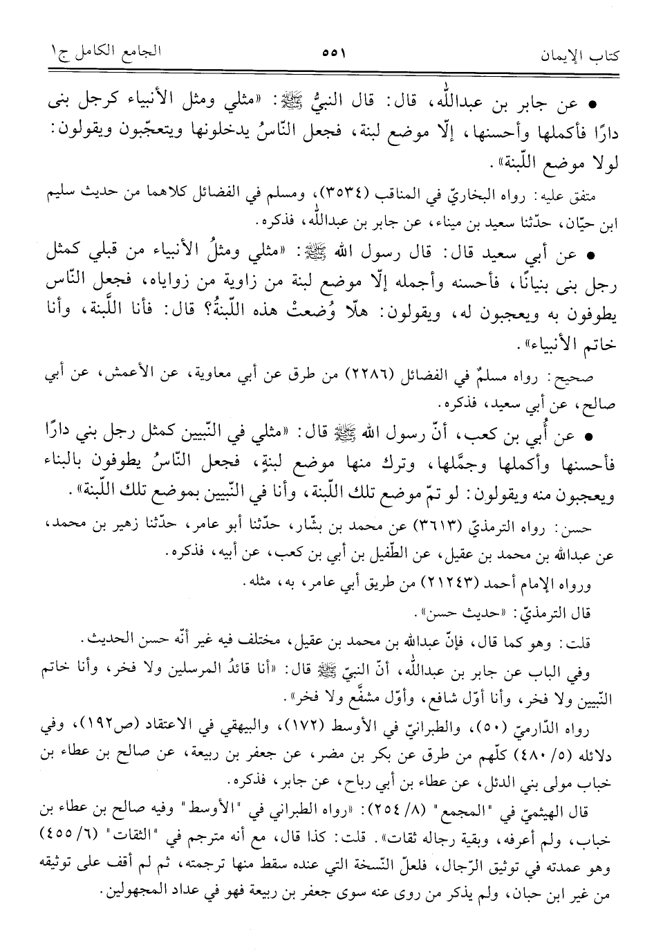 • عن جابر بن عبد اللَّه، قال: قال النبيُّ -صلى اللَّه عليه وسلم-: "مثلي ومثل الأنبياء كرجل بني دارًا فأكملها وأحسنها، إلّا موضع لبنة، فجعل النّاسُ يدخلونها ويتعجّبون ويقولون: لولا موضع اللّبنة".