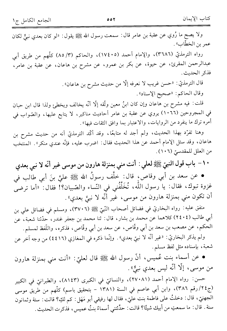 • عن أسماء بنت عُميس، أنّ رسول اللَّه -صلى اللَّه عليه وسلم- قال لعليّ: "أنت مني بمنزلة هارون من موسى، إلا أنه ليس بعدي نبيٌّ".